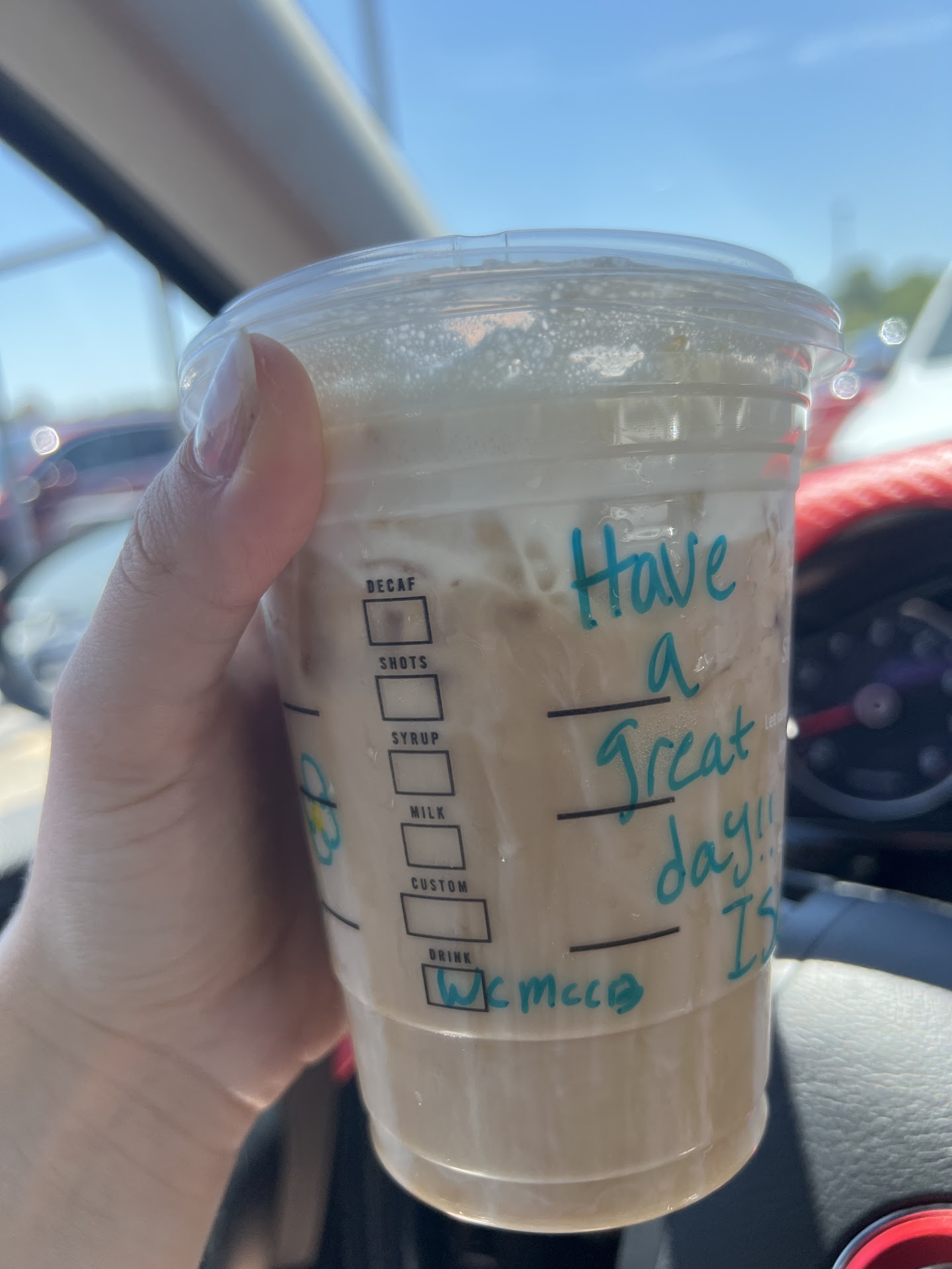 After all that, she tries to put the same curdled creamer back in my order. I asked if I could have a new carton and she assured me that the creamer did not expire until September 13th and she didn’t think the rest of the creamer would be bad. I insisted to get different creamer. She couldn’t figure out how to open the carton. When she finally did, she triumphantly poured it in my cup.