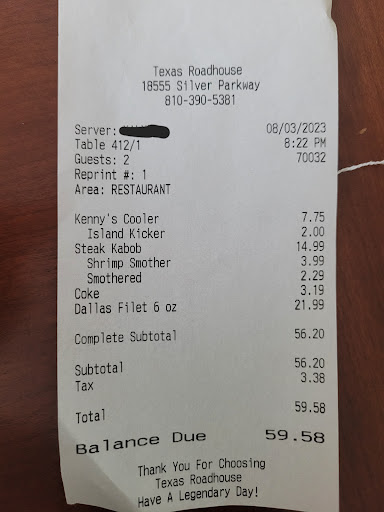 Read moreMy wife and I went here and mid January 2024 to remember her mother who had just passed with a celebratory dinner about her life as well as celebrate my wife's birthday. We were giving a piece of chicken that pigeon breast would have been bigger. Happy either a corner or the overall general manager named JD came out yelling and screaming and threw us out. He claimed that we caused his waitstaff to cry. Fat I was told by four different people who work there that I know that nobody want him crying it was JD that was crying. No threats we're made has JD stated they were which again another lie from JD. The nicest thing out of all this is a gentleman watched the screaming shouting of JD. Found me about a week 2 weeks later and presented me with a 200 dollar gift card to Lucky's Steakhouse. And you know what they were nicer there than any place they didn't try to steal everything off the table before you finish. And the management actually seemed to care about the customer unlike Texas Roadhouse. The only way to get me to go back to a Texas Roadhouse and actually be to fire JD. I'd love to be there when it happened because this is somebody who actually has no customer...