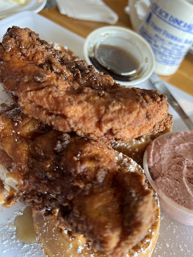 Ā Ā Ā Read moreWe were seated quickly and the menu had lots of options- even to do dairy free. I had the chicken and waffles (3 chicken tenders on top of 4 small round waffles, served with maple syrup and a āblueberry butterā) and he had the Breakfast burrito that came with 2 sides. Food was good. Parking was tight. Getting there from the opposite side of the road was challenging. I dropped a star because the booths were tight. I am below average height and I was sitting with my chest against the table. No breathing room at all. when I slid into the booth my hand came up with someoneās hair. That just grosses me out. It wasnāt in the food. But when I saw how sloppily they turned over a table (cursory wipe down) I knew why. So I know that is a one off experience so Iād go back. Maybe sit at a table? The server for the table next to us handled a difficult couple. I heard their order - both altered the standard menu item, and changed something after their turn. I still followed because he wanted what she didnāt and visa versa. The food came out as ordered and they complained that it wasnāt right. Iām thinking- yes it is. The server was polite and they were satisfied. The food was good and the only thing I would change is...
