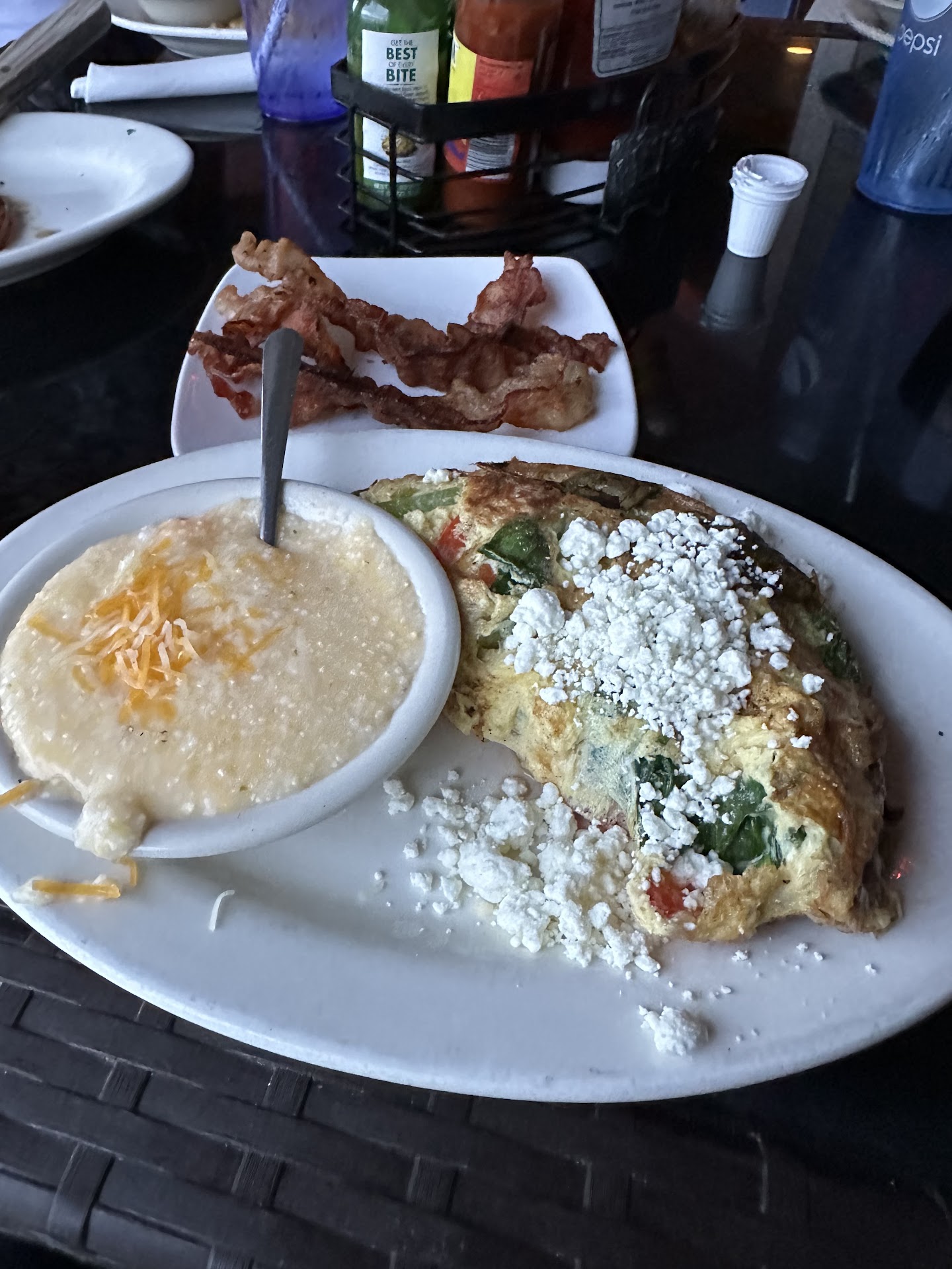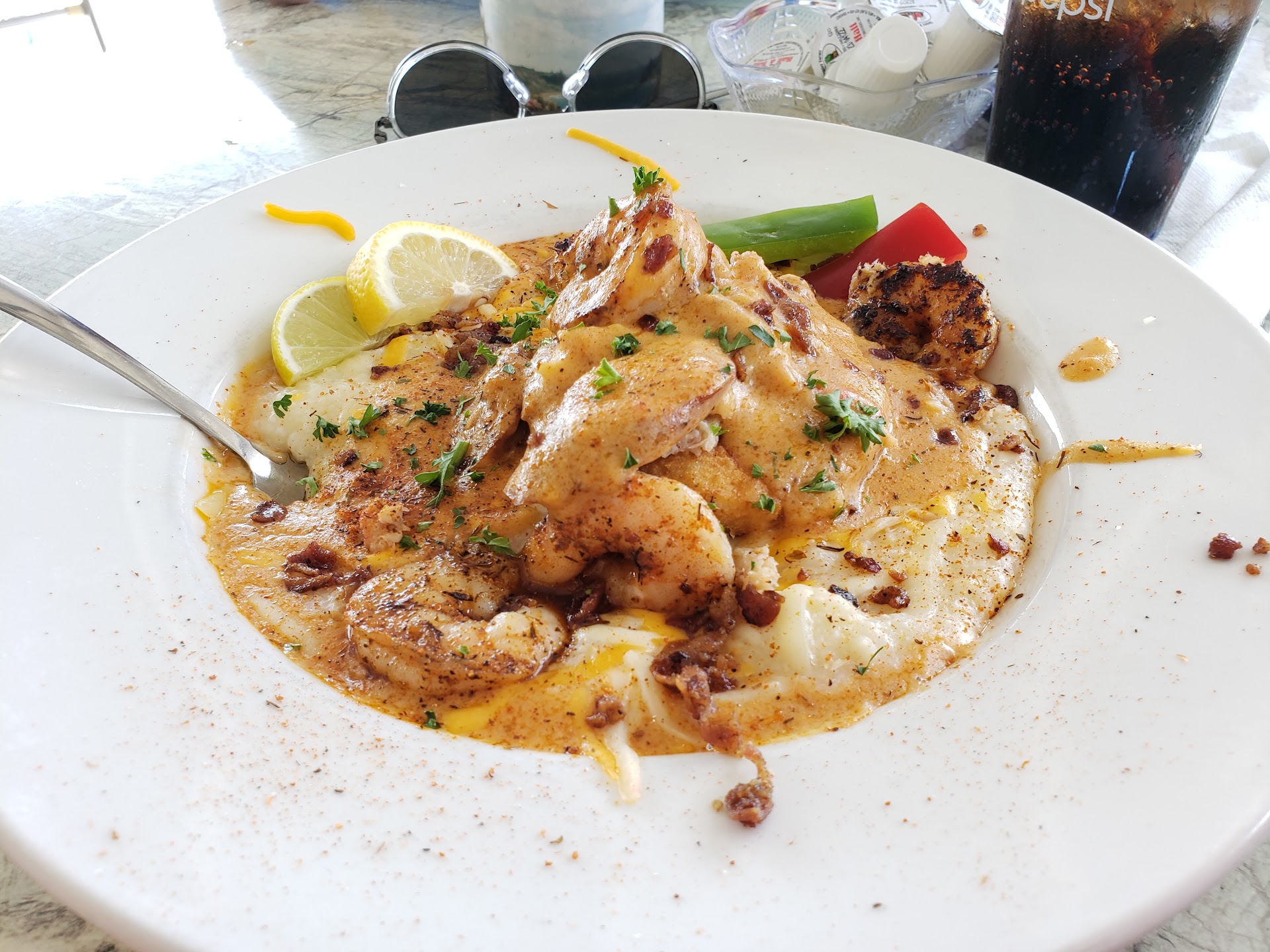 I just happened to come across this place looking for a great place to eat and have a view of the beach n ocean, fabulously lucky after patiently waiting to get the perfect seat with a great breeze and view. That i would give 10 stars 🌟. I ordered the Shrimp n Grits, Jennifer said they are the best and never a complaint, UMMM I beg to differ. It doesn't state in the menu (I looked again maybe I overlooked) that they put pork in the dish and I don't eat pork. I ate around it best I could but disappointed about it. Just the wait for anything I had already been there for such a time I did want to keep waiting. The sauce is salty and muddled the other flavors. I ordered it blackened if you pull the Shrimp out eat it more individually it has a great flavor and the were cooked perfectly juicy. The grits had a big clump of a fried grit in the middle I don't think to be so successful, I've had better fried grits that has a nice creaminess but this one did not was kinda a one note clumpy mess. When I make it back in town I will give it another go but definitely ask to see what or if there are any hidden mystery items in the dish that would...