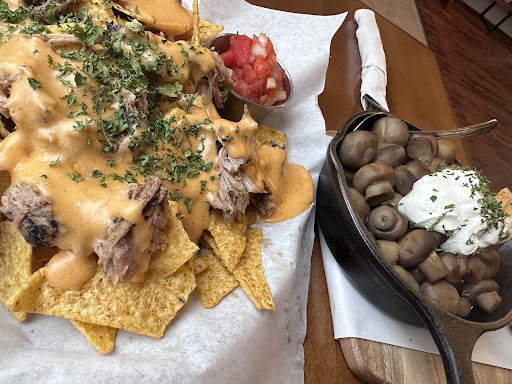 Read moreIt is a big space and I really wanted to enjoy it. The shuffleboard and games in the back were fun for the kids. We went around noon-1pm on Saturday and it was pretty empty. We ordered four things to share amongst our small group and it all came out cold - soft pretzel plate, side of cornbread, pork nachos and the olive plate. The pretzel and cheese dip were cold; the pretzel seemed store bought and rather small. The pickled veggies were just two different kinds of onions. The same cheese dip was used on the pork nachos. Although the pork was tender, the cheese on the nachos and the pork were also cold. Beware it does come covered in sour cream and not much else. The cornbread was undercooked and was also cold (it was useless to try and spread butter on it). The olive plate did come with a lot of olives, too much really. I hoped the sliced baguette bread would be toasted or warm, but it was not and seemed to have been sliced earlier in the day and was a little stale. Maybe we ordered the wrong things, but we were very disappointed with our meal. Also, you order at the counter and they bring your food out. The server spilled and broke a glass of red wine all over my husband's pant leg, the table, and our silverware. They didn't replace the silverware and we had to get up to ask for it. No one checks on you to see if the food was good or if you need anything else. Hopefully they can make some positive changes because it is...