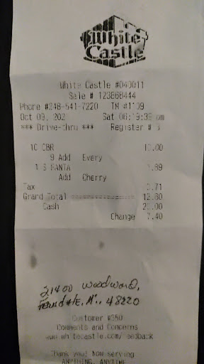 Read moreSo, we went around 2 pm. Staff was cordial but on the verge of irritation seeing that it was a large order for a family of 5 who hadn't been to White Castle in a number of years. Sorry for bothering you at work, smh. We ordered a crave case along with chicken sliders, various drinks, fries, mozzarella sticks, etc. It was an approximately 25 min wait, which by itself wouldn't have counted against them had the food been fresh. They must've prepared the chicken sandwiches, fries and mozzarella sticks before doing the crave case bacuase all of that was cold and unenjoyable on the ride home just after collecting the food. Driving down Woodward in traffic just to turn around to have them replaced, mind you after having already waited approximately 25 mins the first go round, would have been extremely inconvenient, especially seeing how the rest of the family were to be delivered from school to home any moment. I say that to help you understand how much the borderline attitudes from the employees were not appreciated during the immediate phone call to lodge the complaint about the cold or undercooked food (couldn't tell which).