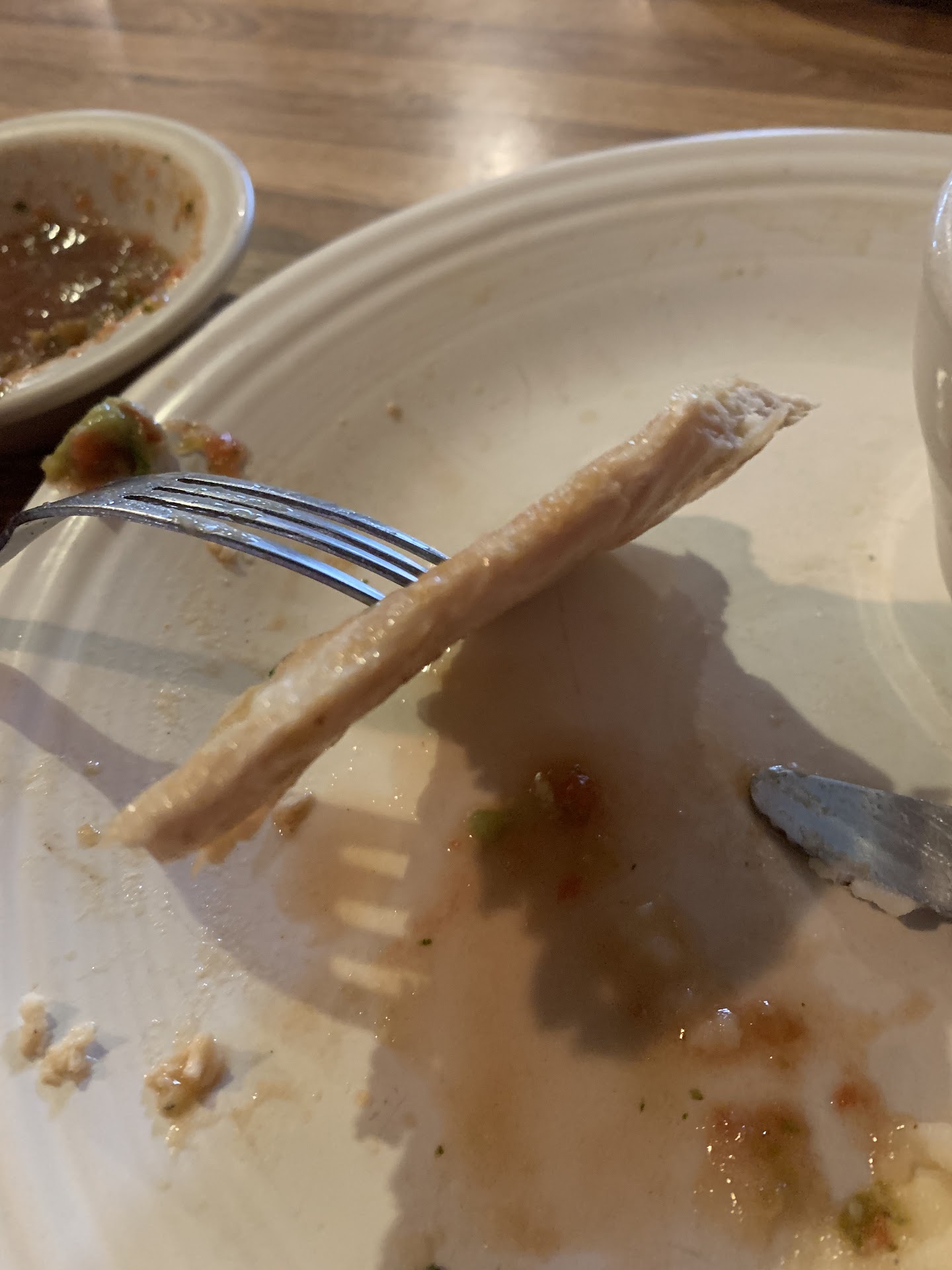 My “grilled chicken” was an unseasoned piece of chicken jerky, measuring roughly 4 millimeters thick. Wtf? Is this a joke?