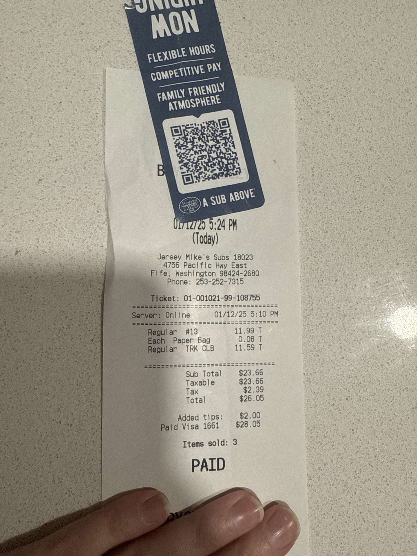 Read moreI have to say that I love jeresy mikes as a company, there food has always surpassed any other sub restaurant (Jimmy John, subway or even Quizno) I have ever been to, the #13 is my favorite go to sandwich. this location,needs to get it together, the wait times are borderline horrible, and the only reason I say that is because I know that the other 2 locations in the Tacoma area,(the one in Lakewood and university place) has probably even more of a reason to be slower but they manage to get it done... I don't understand how you could call in an order or order online and it takes me 20 mins to get to the location, and the order is still not done making you have to wait another 5 to 10 mins. I would probably have to say that's there are lot of young people working there and I'm not faulting that or saying that's the cause of the issues here, hey we all had to start somewhere.in life.. i would probably recommend them to be trained by one of the other stores, maybe even hire more people at this location, most folks don't have 45 mins to wait on a cold sub order enough of the negative. on a positive note the staff is friendly and helpful, willing to correct mistakes, there is always room for improvement and growth. But that's with...