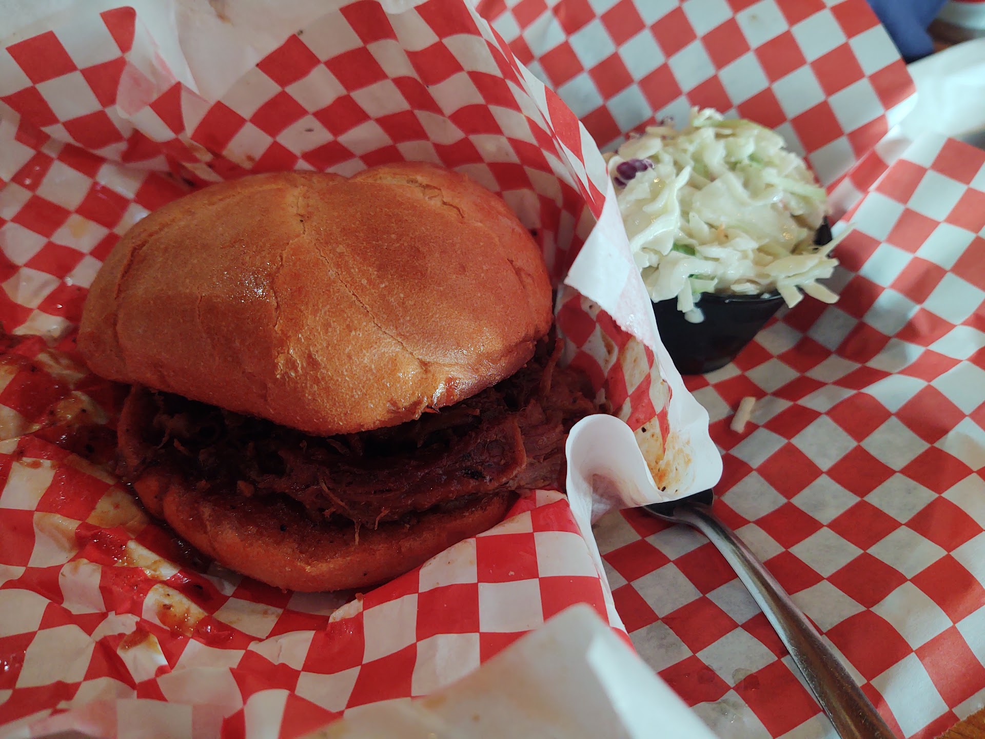 Let’s get to the food. I’ll start with what I liked. Flavor was excellent with everything! I got a BBQ Rib meal that came with coleslaw and beans with a cornbread muffin as well as a pound of brisket. Beans were fantastic. Tasted a good bit of seasoning in them that makes me think of it more as a chili than baked beans. I put a couple dabs of their bbq sauce in them and that was just right for me. On the subject of sauce, it was a sweet sticky sauce with a slight tang to it and a little peppery spice on the back end. It was kind of in between a Kansas City style sauce and a Memphis style on both flavor and texture, I very much enjoyed it. Cole slaw was just how I like it. Long stringy cabbage not that finely grated stuff and it was a little sweet.