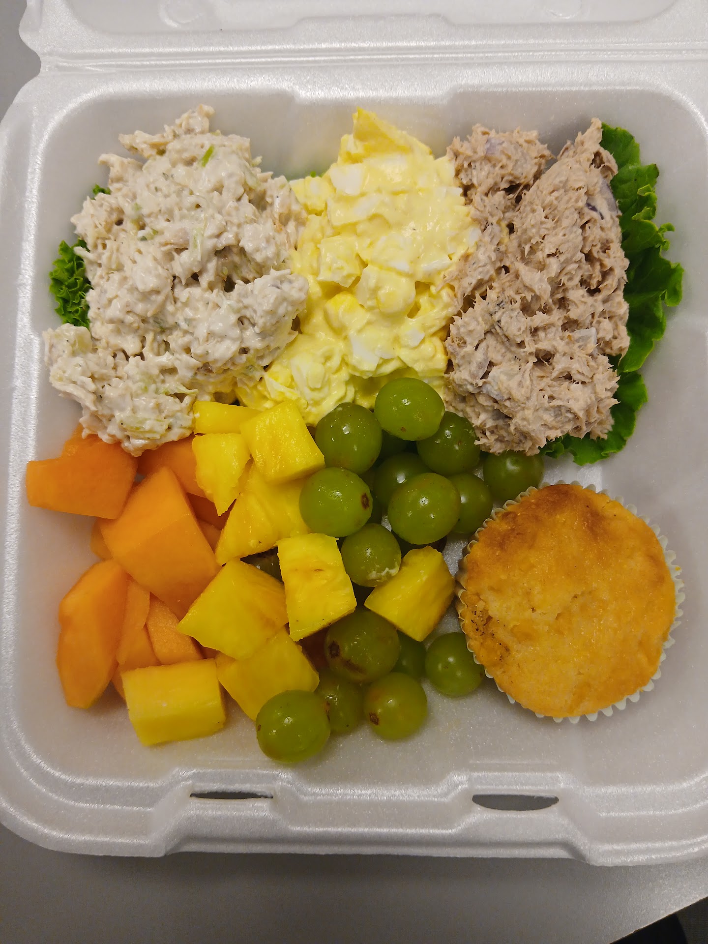 Read moreSorry to say but the egg salad, tuna salad and chicken salad were all very bland. The same could be said for the chicken bacon nachos. Tomatoes were fresh. Fruit was fresh. Corn muffin was definitely not for me. It was kind of bitter. I don't think it was necessarily bad; just not the most seasoned food. I could certainly think of many people who would really like this, so certainly give...