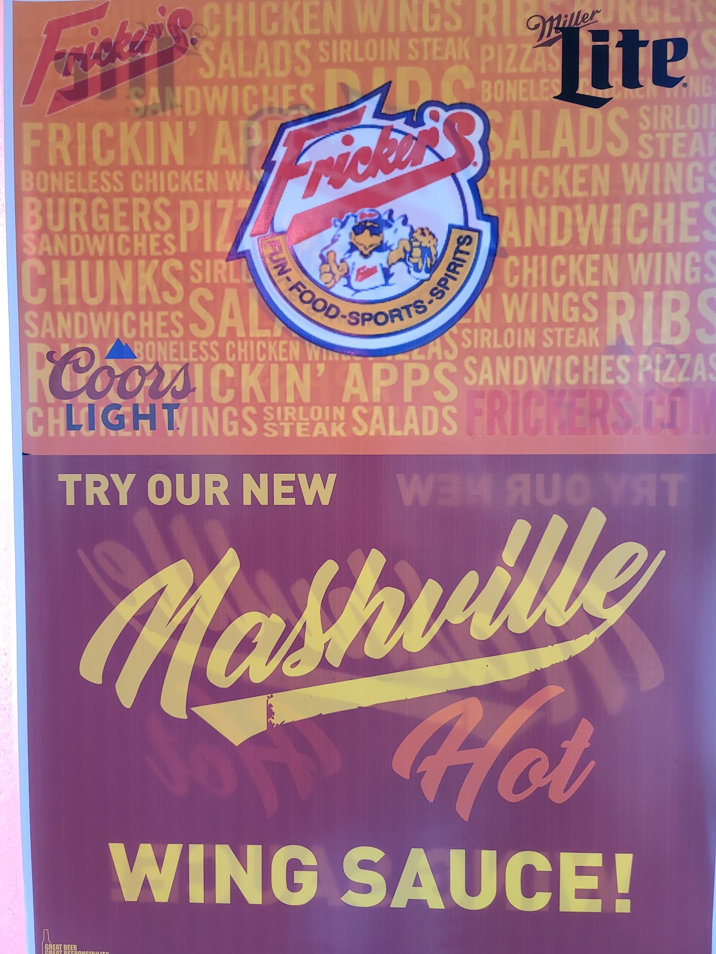 Read moreThis was my second time visiting a Fricker’s restaurant and it is as mediocre as I remember from the first visit. Our server was very nice, quick and efficient. The chicken wings were big, hot and cooked well. I got the Kicker sauce mixed with Garlic and there was not even a hint of heat. One of my wings fell off of the plate and onto the tray and the server asked if I wanted that wing or not. I did not, but she didn’t offer to bring another one or anything else. My beer was missing about a quarter inch from the top, which to me meant it had likely sat at the bar long enough for the foam to go away. Someone should have noticed that before it went out to the table(not the biggest deal). The size of the ranch and blue cheese that came out for 10 wings was very small and not even enough for me to dip each wing one time(mind you I only got 9/10 wings and three got no blue cheese). I understand I could’ve asked for more, but there should be a reasonable amount brought to the table the first time. The potato wedges were not hot and had zero crisp to them. The curly fries were cold. All in all an experience not worth...