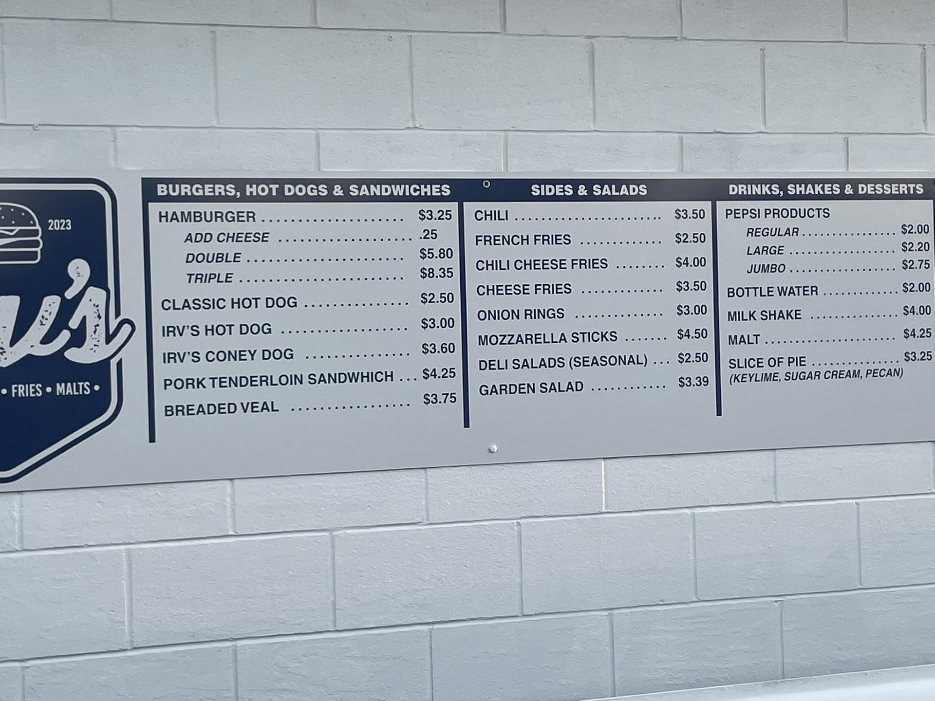 Read moreWent to Irv's today, had a double cheeseburger, fries, and mozzarella sticks. I was hoping the kept they battered cheese sticks from the previous business but alas that was not the case. My burger was good but they got the toppings wrong, I live 20 minutes away so I wasn't going back for an exchange. Overall this place is good for a four star review. I will definitely...
