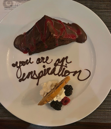 Desserts: Pecan Ice Cream Pie with chocolate and caramel drizzle cheesecake with a raspberry drizzle (I could bath in that drizzle! Lol) Chocolate cake with raspberry drizzle with “you are an inspiration” written in chocolate on the plate
