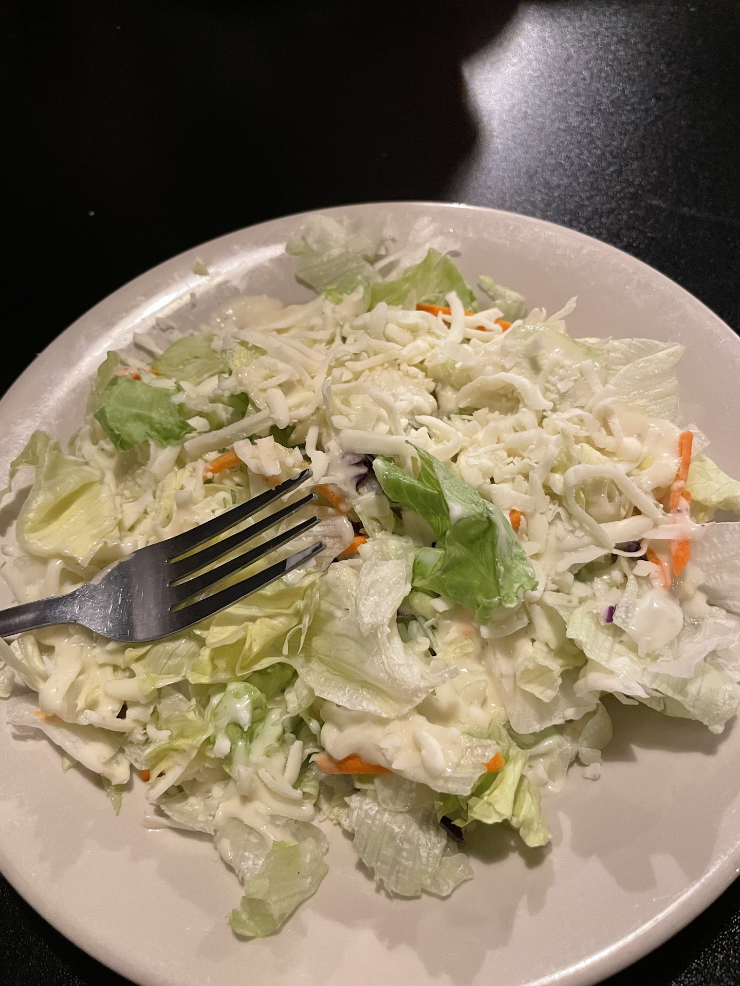 A modest salad followed, a refreshing interlude of iceberg and romaine with the usual adornments of shredded cheese and dressing—a palate cleanser more than a centerpiece.