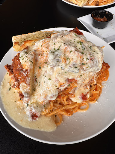 And then came the headliner: The Big Fat Tony. Imagine a theatrical entrance—our server needed both hands to deliver this leviathan of Italian-American bravado. At its base, a tangle of spaghetti cloaked in a marriage of creamy marinara and Alfredo sauces. Atop that, a hulking square of lasagna, oozing molten cheese and layered with hearty meats—even salami, a delightful surprise. This was crowned with chicken Parmesan, then cloaked once more under a hearty, sausage-studded Bolognese. The entire creation was bound together with molten broiled cheese, draped like a decadent curtain over the entire composition. On the side: a slab of garlic bread so immense it could have been a meal in itself, toasted to a satisfying crunch with a garlicky perfume that filled the air.