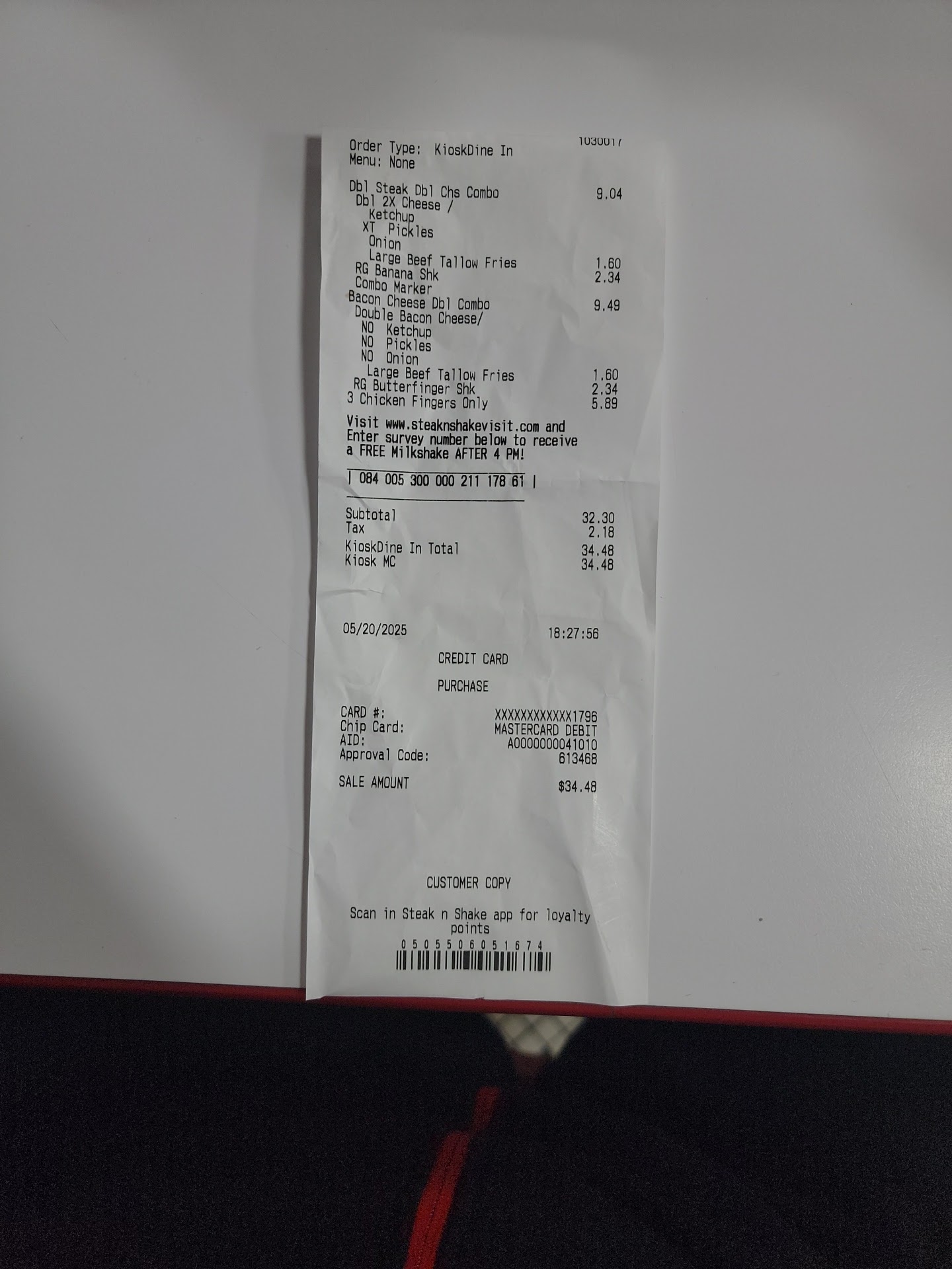 Read moreThe lobby was closed so I had no choice but to go through the drive thru. After sitting there for 5+ minutes waiting for someone to acknowledge my existence I was finally able to place my order. I then spent another 10+ minutes waiting to receive my order. I was the only person in line. After pulling away we realized that they forgot a part of the order. We then had to turn around and go through the drive thru line again. By the time we were able to eat the entire meal was cold. The sides of cheese tasted they were old. The chicken tenders were anything but tender. My child wouldn't even take a second bite of the grilled cheese and I once watched him go for a second bite of mud. The burgers were burnt and dryer the a bucket of sand from the desert. The fries were still frozen. Literally not a single bit of this experience was pleasurable. This review is from a couple who had their first date at this very same location and who's nostalgia may have blinded us from the decline of this restaurant during our monthly visit. We have gone from celebrating our anniversary here, to having settled on never eating at another steak n' shake again. I would like to end this by thanking the staff at this location. Thank you for ruining a special...