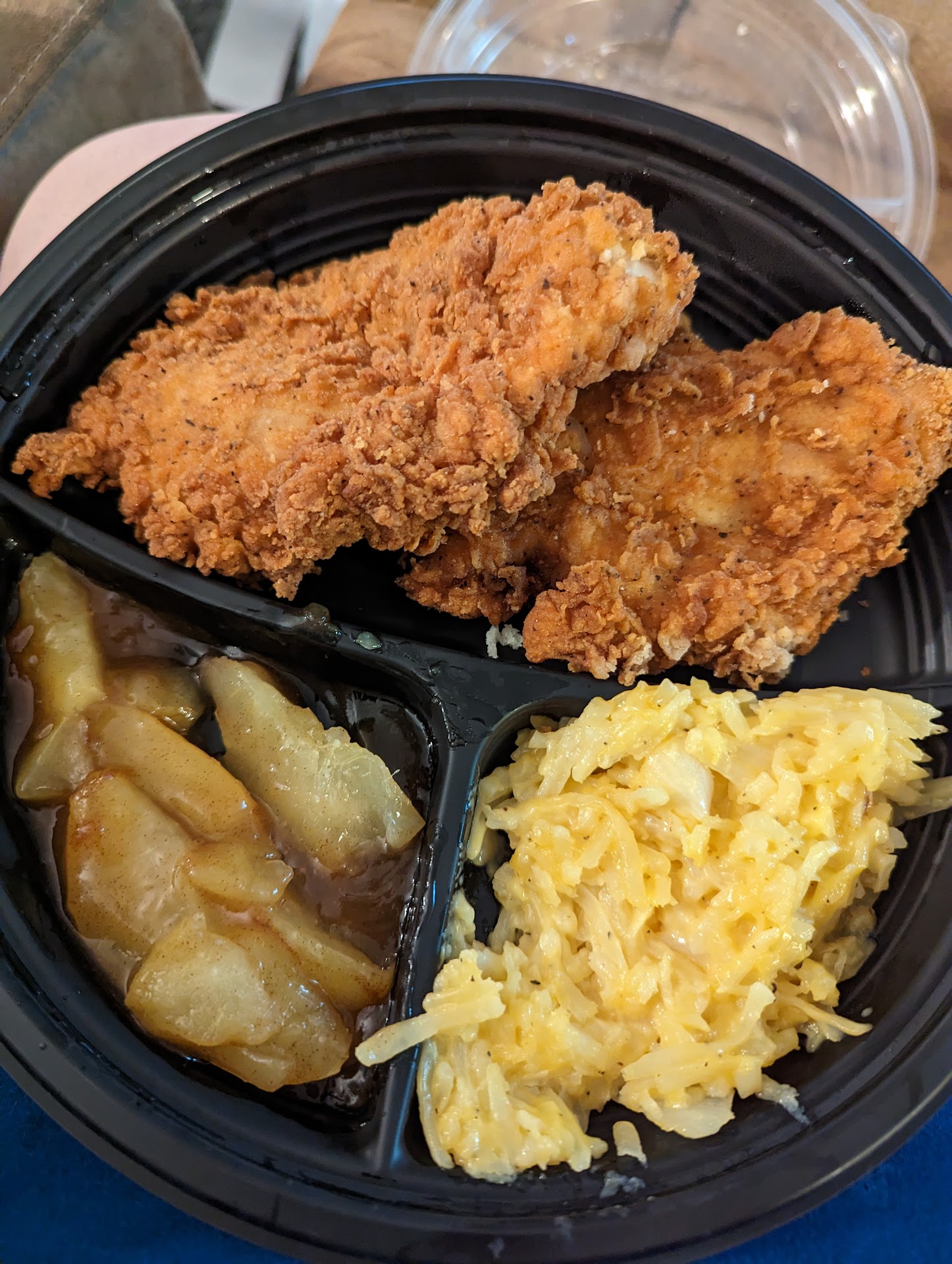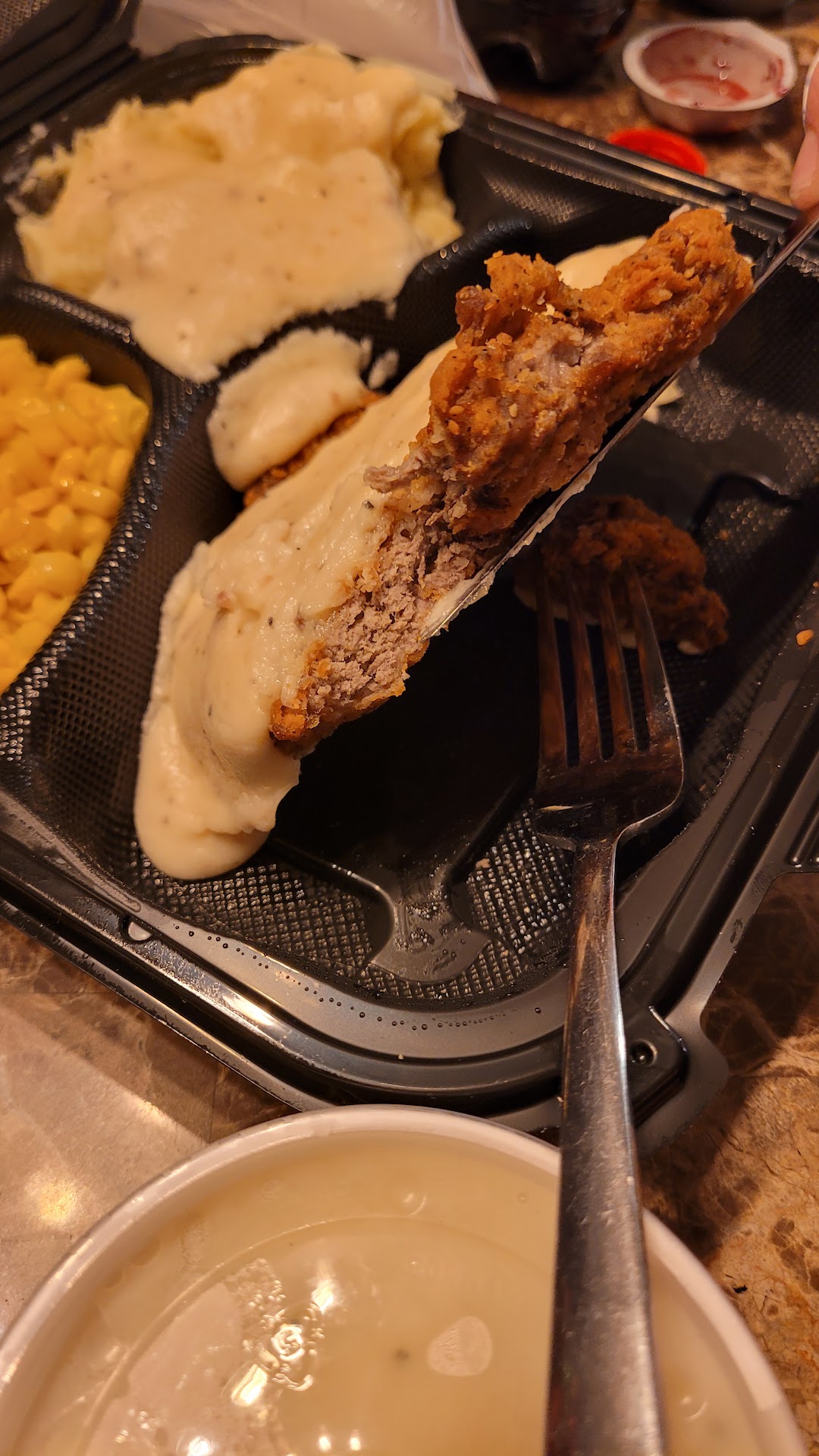 Last but not least, after getting home, we opened up the containers to find one of the meals was wrong. My wife ordered Chicken fried chicken and the meat was actually something else.. I don't know what it is but it's definitely not chicken (see attached picture) and I'm now leaving again to go get food somewhere else.