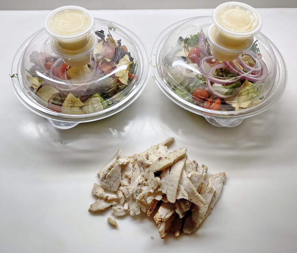 When she arrived home with our salads, sides and flatbread, we discovered that the salads had chicken on them (we're vegetarians and requested no chicken) and the Margherita flatbread had tomato, but no basil. Too bad (a) it was her birthday the next day and (b) basil is her favorite.