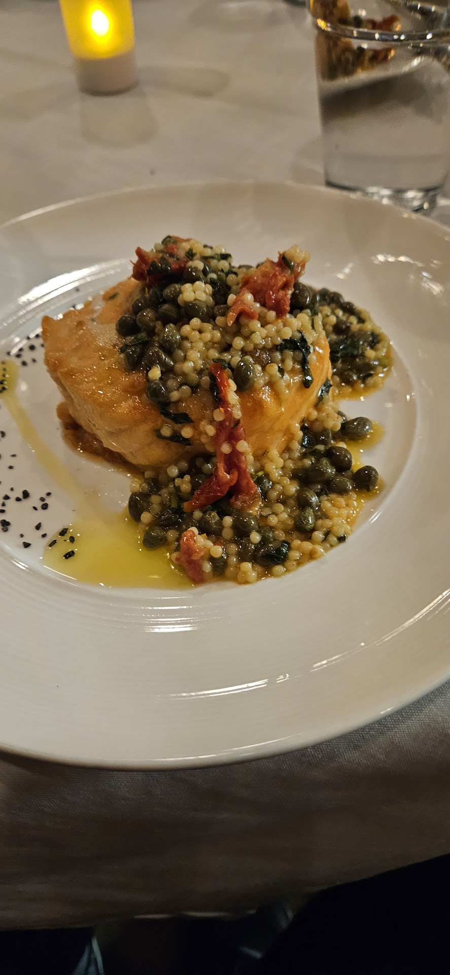 Then the peppercorn crusted fillet. Ordered medium rare, there was a half inch of well done around the edges and the center was raw. Sent it back, then received a more-cooked version of the same. The owner/chef let us know he wrapped it in lettuce and baked it to finish? It is the only steak option on the menu and I cannot recommend it. The lady and I both have fish-tasting indigestion and I'll leave it at that.