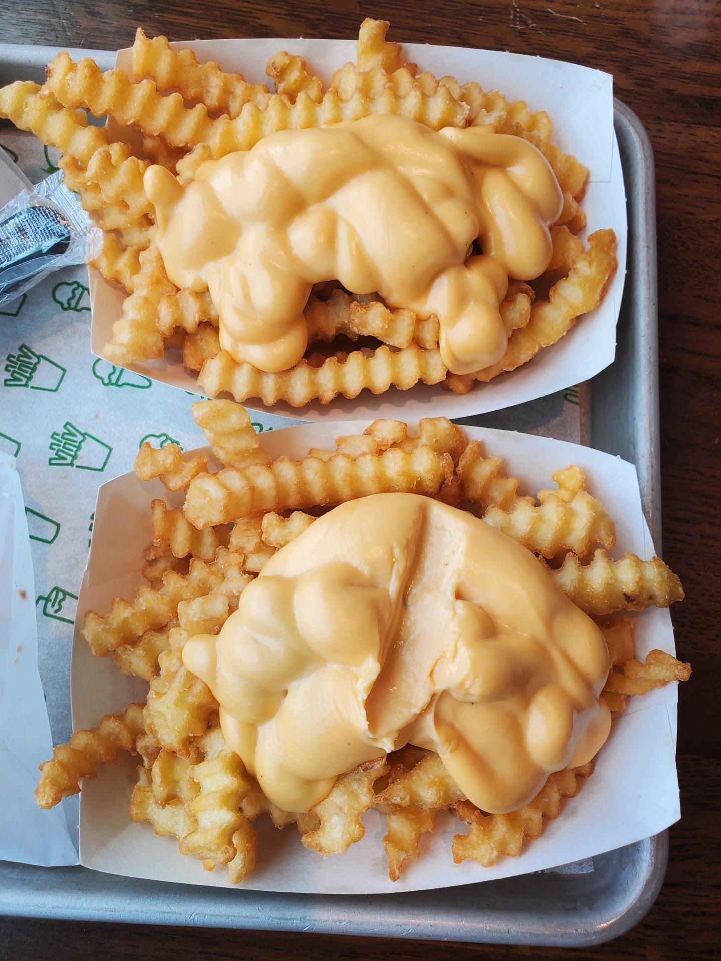 So let's talk about the food, I had gotten a single ShackBurger, Cheese Fries, and a Chocolate Pudding Shake. When I first opened my burger, my initial expression was the burger just looks sad in how it was packaged. I had to rip open the wrapper to take the picture. While it look sad, the burger you could tell was a higher quality of beef, but the topping just seemed to melt into the burger. The lettuce texture reminded me of overdone spinach then lettuce, and the tomato I could barely taste, even though you can clearly see it in the picture. The special sauce that was on there, I feel like it blended in with the cheese and it really didn't stand out at all.