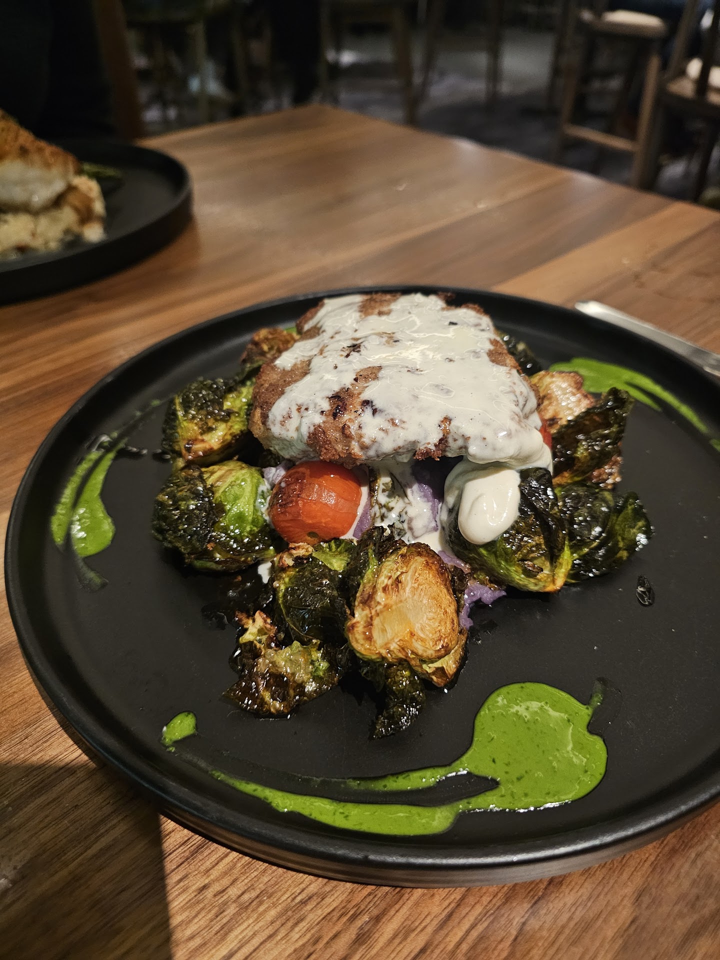 I had the Pecan crusted halibut with purple mashed potatoes, flash fried Brussels (I substituted this instead of the spinach), dijon honey cream and blistered tomatoes. The fish was tender and flaky, the crusting added great texture and butteriness. The purple potatoes were outstanding and perfectly seasoned. The Dijon cream really brought it all together. Zero complaints. A very well composed dish.