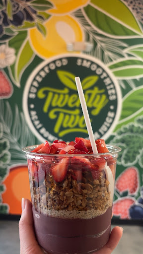Read moreI have been to several acai bowl places in Hamilton County and Twenty Two is my new favorite! I am so glad my friend told me about this place because I didn't even know it was in Fishers. The girl in the hat who took my order was incredibly friendly. I got the peanut butter bowl and it was delicious. The produce was very fresh and the granola was not too sweet. They also had a good selection of organic snacks and protein bars, which I am looking forward to trying in the future! I also love that this is locally owned by a family and not a...