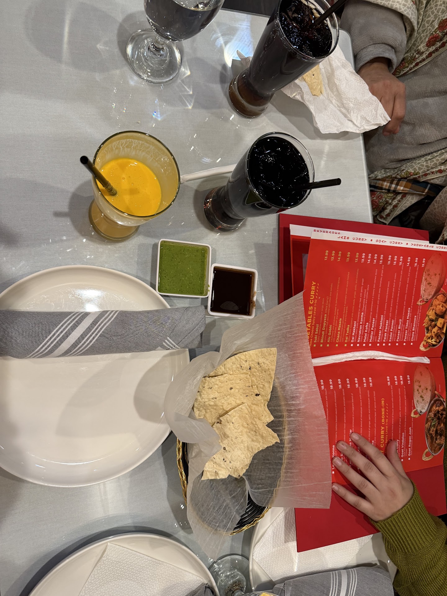 We ordered, chicken tandoori, Chicken tika masala, Naan, Chicken Bhuna masala. We got complimentary papad with green and sweet sauce. Thumb rule is if any Indian chicken item is served with chicken breast only then its not aiming for indian crowd and just skip the restaurant when choosing. We had the same issue, all the curries had boiled chicken breast in them. Tandoori chicken was good but dry. Seems like it was prepared sometimes ago and was reheated served. Asking for some green chutney took forever. Also our request to bring naan with Tandoori chicken was ignored even after 2 requests. Naan was under cooked i.e. you can feel the raw dough in your hand. But the waitress was quick to bring us freshly made ones. The first server lost his patience before taking our order and left midway saying you can order the rest later. That was a shock but the lady was quick to come and take full order. Also between meals when we tried to look for someone to order extra items , no one was available in sight. we had to wait .
