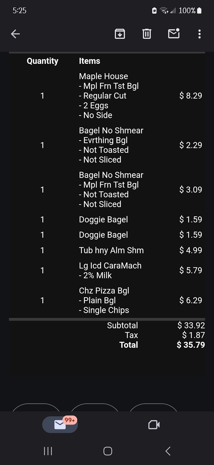 When the order came home the sandwiches were all wrong. We ordered the new maple house sandwich and it was on the wrong bagel but also missing an egg and the bacon on the sandwich. The plain bagel they used had a large crescent shaped chunk out of the top of the bread.