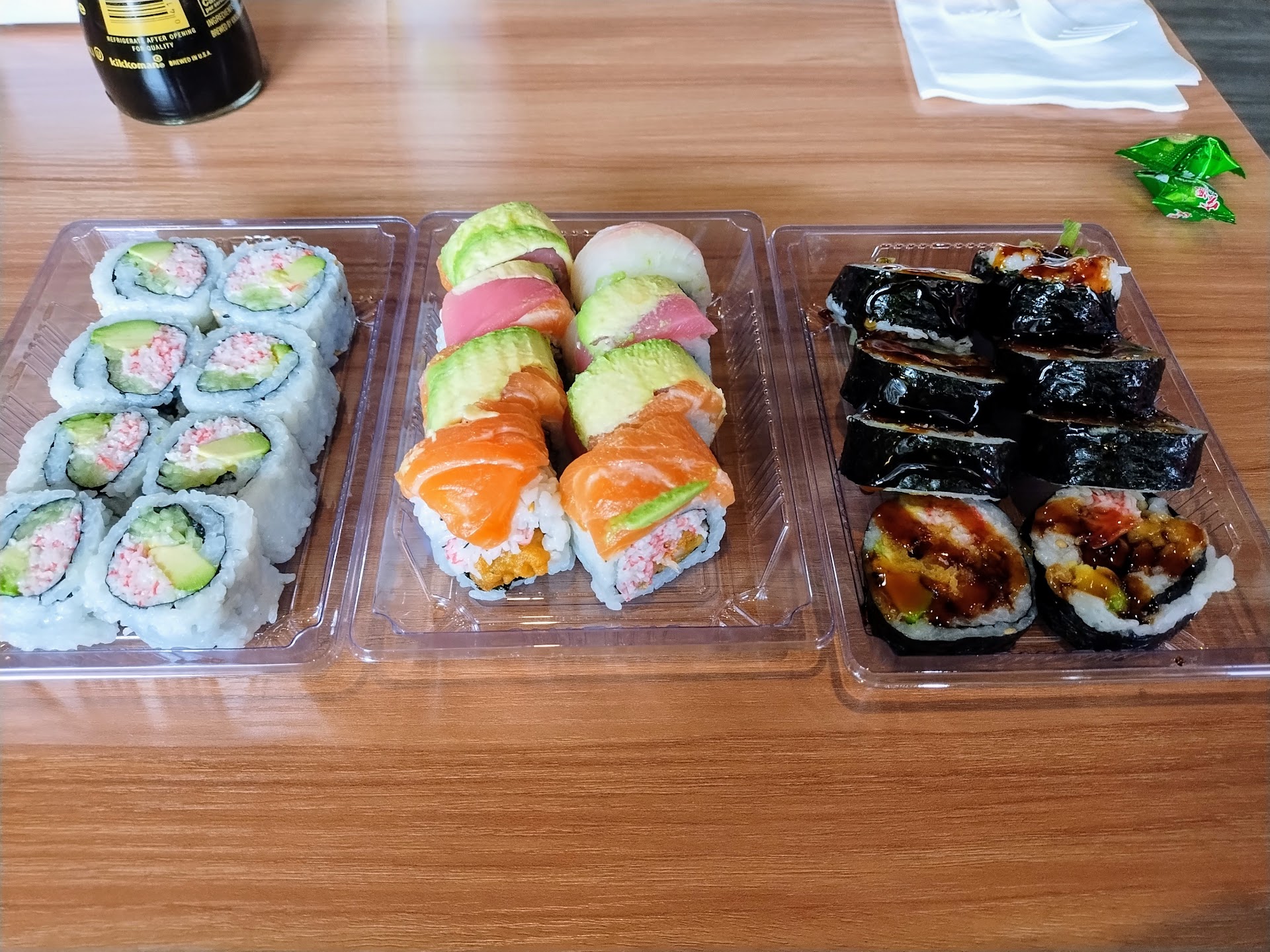 I ordered three fairly common sushi rolls: California, Shrimp Tempura, and Rainbow.