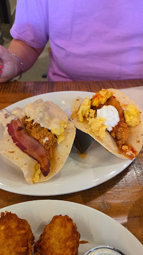 Ā Ā Ā Read more10/10 top breakfast spot in the area. Friends from out of town came to visit last weekend and my wife picked this place. It was my first time here as well but she'd been here before. Love the way they call your order out. Question of the month changes and for the month of June the question was "if you could star in any movie or TV show, what would it be?" I went with my favorite show King of Queens. So when your order is ready, they call out whatever you said. Absolutely love the idea. I ordered the eggstreme biscuits and gravy with spicy sausage gravy. My wife ordered the specialty tacos and an order of the smash browns. I ordered 2 iced biscuits for us and our friends to try. Whatever they ordered had chicken and they said that was probably some of the best chicken they'd had. It really was delicious. The biscuits and gravy was fantastic and super filling. The wife loved her tacos but we had different opinions on the smashbrowns. To me they were a bit dry and I just wasnt a fan but she liked them. Now it's got to be a crime for those iced cinnamon biscuits to taste THAT GOOD. Wow. Everything was just delicious and we left so full. Looking forward to coming back to answer the next question and try...