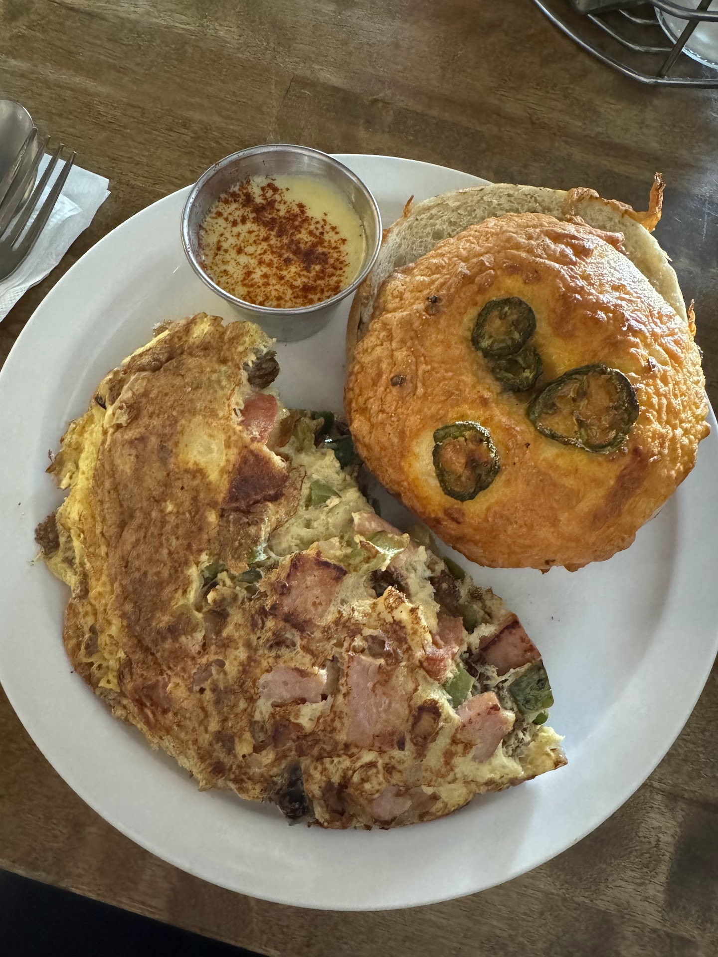 I had an omelet. It came with a side of hollandaise. The sauce is actually super thick and delicious- I will say some of the best hollandaise Iâve ever had. I subbed a homemade jalapeño cheddar bagel- also a win. The omelet looked a bit over cooked but I thoroughly enjoyed the flavour.