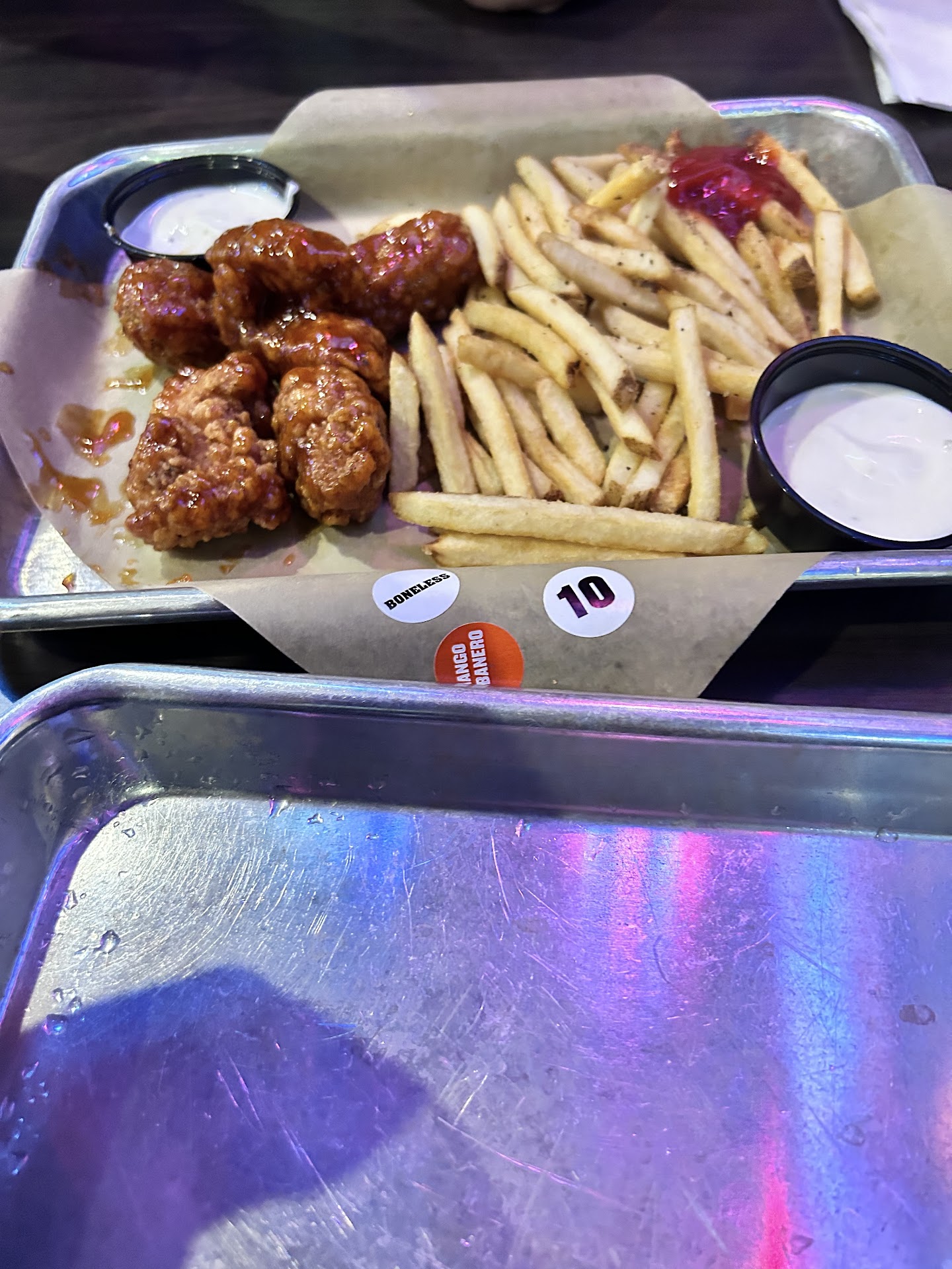 Read moreWeâve given this location 3 chances, not sure why. Weâre somehow more disappointed every time we go. Bdubs is nostalgic to my wife and I. We both worked at several locations in Cali and Oregon for about 5 years. This location is awful. Our recent visit was at 3 in the afternoon on a weekday. No wait and we were sat immediately. We were one of 5 occupied tables in the dining room so we were under the impression that our meal would be somewhat quick, especially considering itâs all frozen food thatâs tossed in a deep fryer. We ordered 20 boneless wings (chicken nuggets I get it), 2 sides of wedges and 2 drinks. We waited 40 minutes for the food to come out, again 1 of 5 tables and we ordered chicken nuggets and fries. When it finally came out the we pretty blown away at how little care was put into the food. I get its Bdubs. Theyâre not exactly known for having high standards and we go there knowing what to expect. This location however serves horrible food and with horrible service. We asked for cheese on our potato wedges which of course we paid for and got the saddest little sprinkle of cheese, as seen in the photo. Theyâre also soooo stingy with sauce here. If youâre going to charge $15 for 10 boneless wings at least sauce them up. 3rd times a charm, we know never to go back here. Also I should add, we spoke to somebody about our concerns who turned out to the be regional kitchen training manager. 40 minute ticket times and this is what comes out? The trainer needs to...