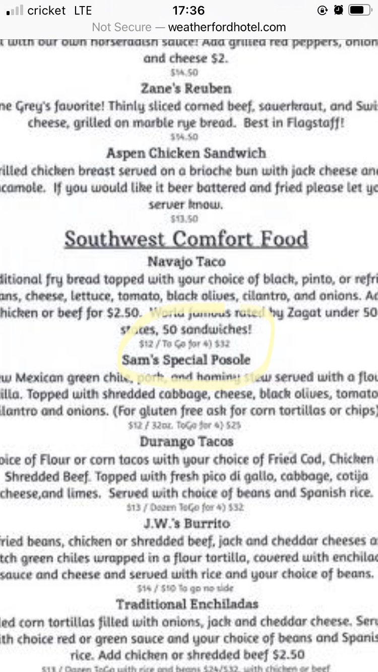 Read moreWe arrived shortly after 5 p.m. and seated immediately. It took over twenty minutes to talk to our waiter. The "manager" stick his head in and leaned on the bat to look things over but did not offer to get is drinks or anything. Service with the waiter was erratic throughout the dinner but he was hustling. We were ready to order. I ordered soup and the prime rib. She ordered posole as an appetizer and the Navajo taco for dinner. My soup arrived relatively quickly but hers arrived later with the dinner. I ordered the prime rib rate and it came out very rare. Considered sending it back to warm it up a bit but the waiter never came back. He took my soda glad for a refill but never came back with it. There was supposed to be bread with my dinner but it never arrived.