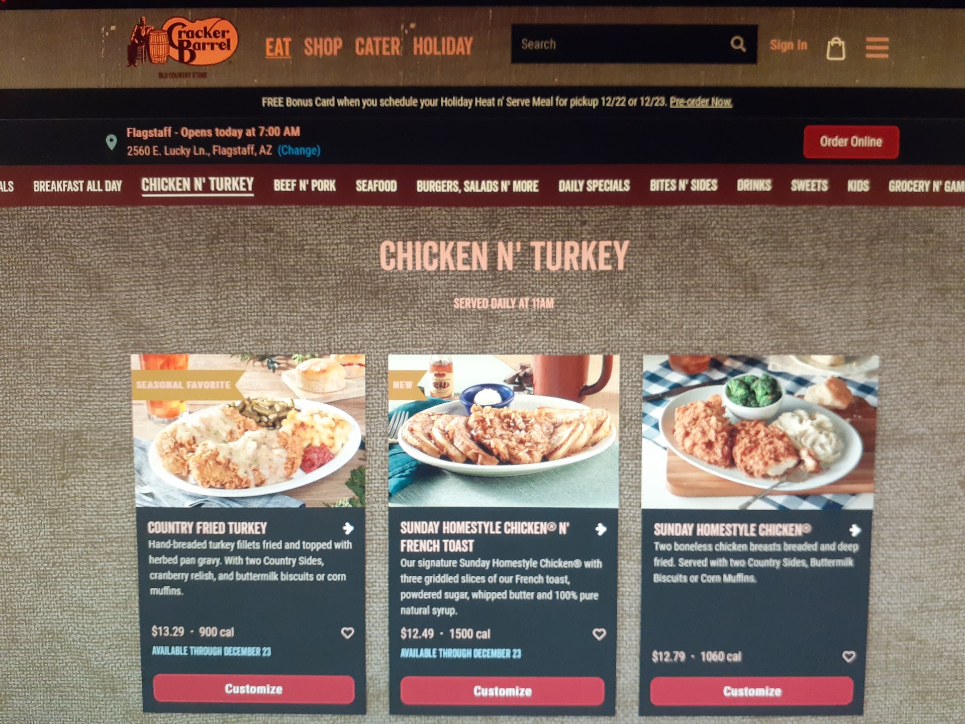 Before I start, it should be mentioned that by far, the main dish that I always order when visiting a cracker barrel - regardless of the situation - is their famous chicken and dumplings. The continuity of the flavor and texture is comparable to McDonald's and their name to fame burger. As far as restaurants go, this dish spreads across Oklahoma, Arizona and California as a dish that tastes similar regardless of where you are purchasing it, and I believe that that is very important - at least to me! During this visit, we were in Flagstaff purchasing a Christmas tree, late, I know, but it had to be done before the week ended. We only had one hour to get lunch, so we considered a drive-thru restaurant, but instead finally opted for eating in at this cracker barrel location, and boy... I'm glad we did. It should go without saying, the chicken and dumplings were off the hook, absolutely phenomenal! The steamed vegetables that I chose as my sides were delicious and perfectly cooked. The carrots, green beans, broccoli -- everything was perfectly seasoned and cooked beautifully! My food partner at the time had the loaded potato, which was paired with a grilled cheese sandwich. Sadly, I cannot vouch for their grilled cheese sandwich because regardless of how crispy the bread was on the outside the cheese inside was unmelted and cold, two very big no-no's in my book. The potato was good, loaded heavily, which is always nice. Our drinks were tasty, and the server was a very nice person. we asked her what the wait time the food was being expedited, and she guaranteed 10 to 15 minutes, and the cooks followed suit. The only complaint that I will be having during this visit, is that the bread was horrible. We tried both the cornbread and the buttermilk biscuits, and they were ridiculously dry and tasteless, which was surprising! Every other time I've had any of their bread, it's been delicious, warm, and the texture has been really good. It must have been an old batch or an overcooked batch, regardless of what it was, it shouldn't have happened... But at the time, I did not complain to the waitress, only because we did not have the aloted time. Cracker barrel still remains one of my favorite comfort food restaurants regardless, I'm pretty sure this was just a one-time mishap. Thank you to the Flagstaff team at...