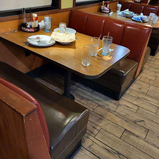 When we stepped inside, the sense of futility and discouragement persisted. Only half the dining floor was open, and only a handful of the tables were occupied. A group of high-school students. An elderly couple with yappy dogs. A pair of workers with their eyes fixed on the remnants of their meal. No one stood at the register to seat us, so we stood around uncertainly for a handful of minutes waiting to be noticed. At last, a red-haired woman appeared, and told us we could sit in the second-to-last booth along the south-facing walls.