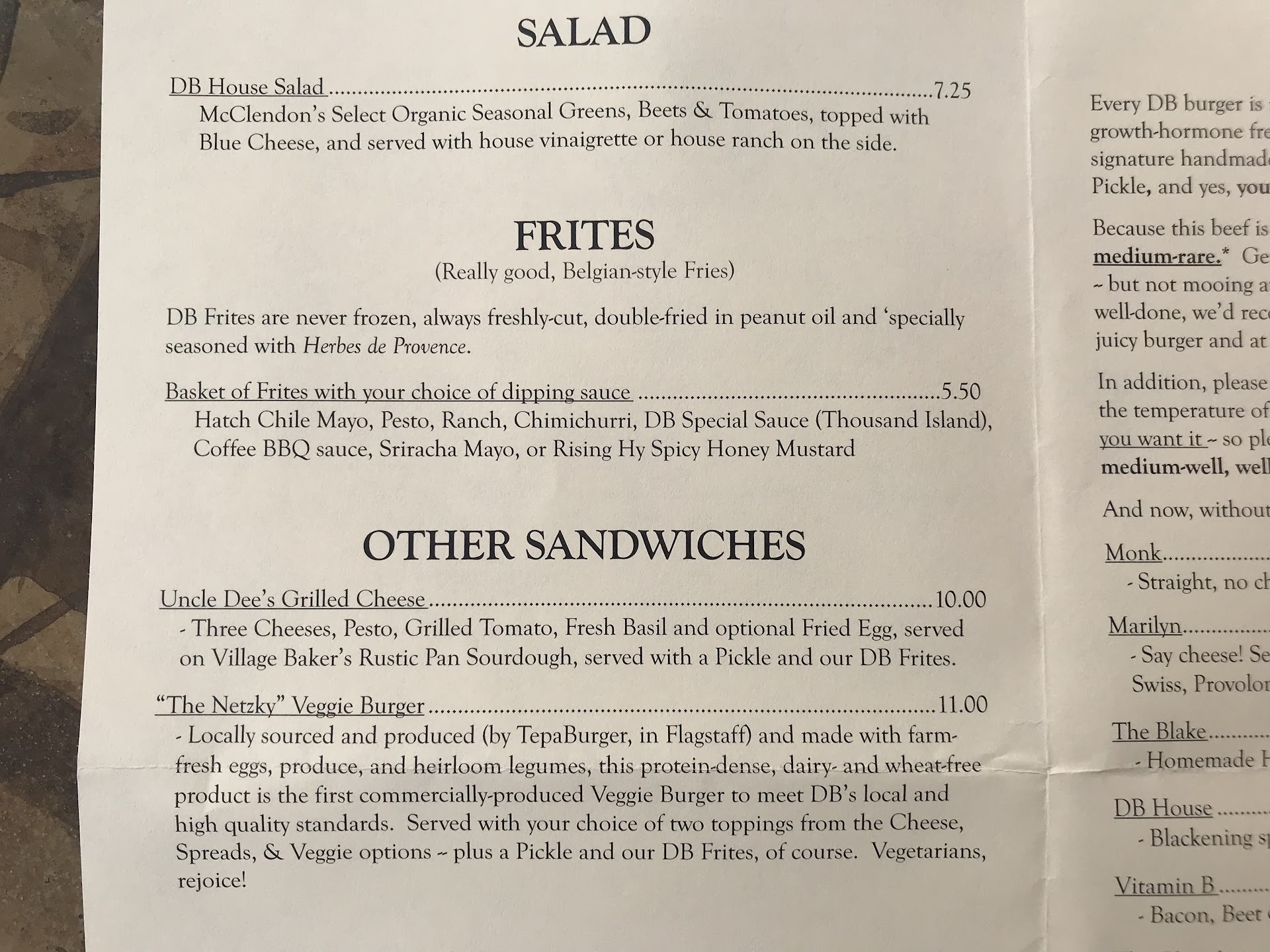 Read moreLocal burger joint that uses English muffins for buns. Came here per the recommend of a friend who was a former NAU student. There’s street parking around the area (only $1/hr and it’s unlimited) that you pay based on your license plate number. It was a little hard to find the place but it’s to the left of the entrance to Mix and it has the sign over its door. You just wouldn’t be able to see it well if you’re driving. You order first (there’s menus outside and a laminated menu at the counter) then sit wherever. They’ll follow you out with your drinks (no number needed) and they ask for your name for the food. Mexican Coke was $2.95 and the burgers ranged from ~$13 to $16. They’ll give you a water jug with cups. The veggie burger was better than I expected and comes with two toppings. I got grilled onions and thousand island dressing plus sharp cheddar for an extra 50 cents. The veggie burger was hearty and full of flavor though a tad bit dry. The fries were my favorite - they’re Belgian style and so tasty. We all preferred the fries over our burgers. There’s ketchup and mustard available at the tables plus the napkins. The Blake Burger came with green chilies that were more salty than flavorful. The Wrigley Field Burger came with bacon (always a plus) and all the burgers had a lettuce, tomato, and pickle spear on the side. The English muffin in lieu of a burger bun seems like a good idea in theory as it holds the patty more firmly but it was also a bit dryer. I like that the beef is grass fed but it also means that the more well-cooked it is, the dryer the meat becomes. We had to ask for takeout boxes because we were full - don’t let the portion...