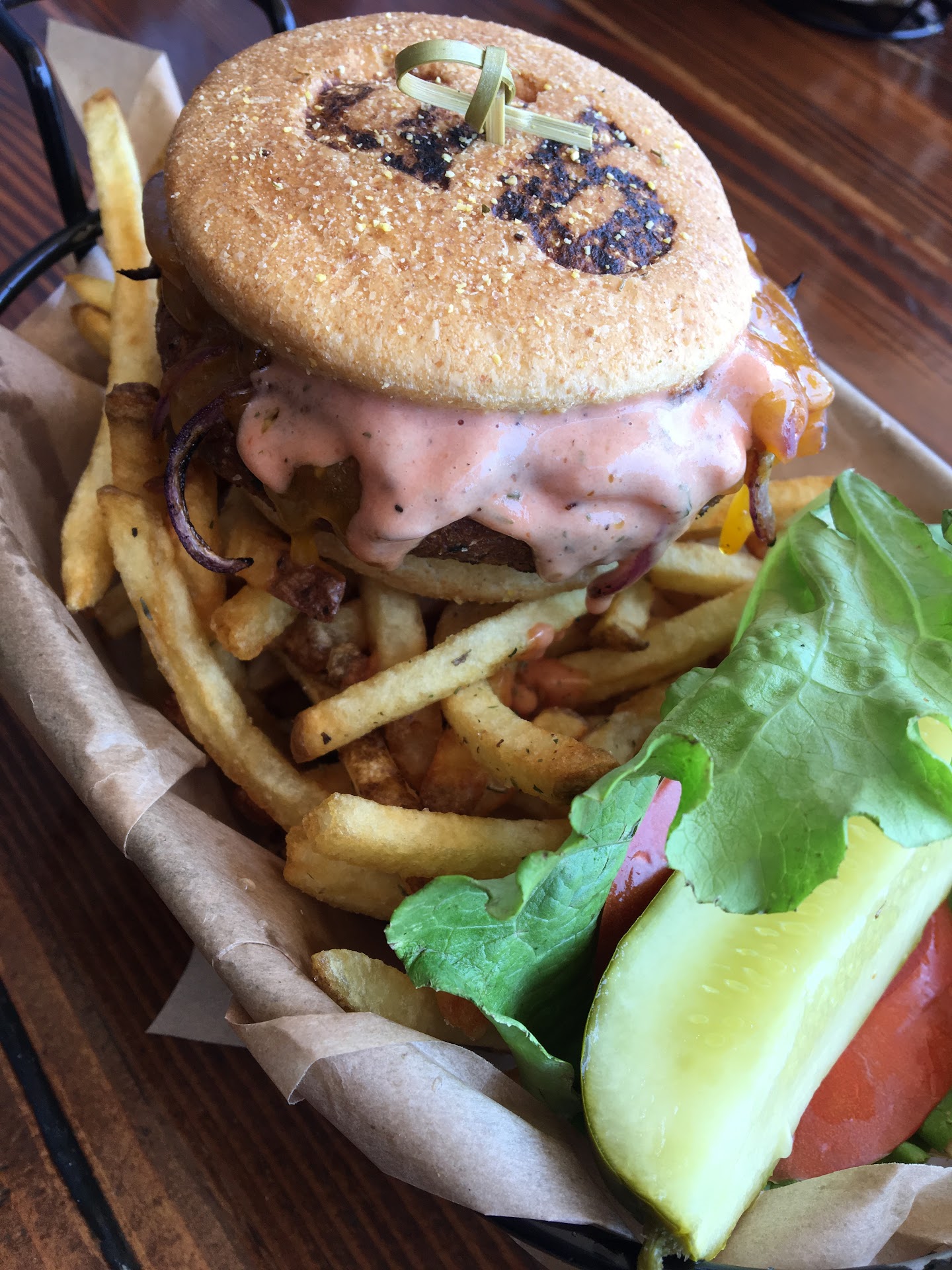Located right downtown Flagstaff in the restored square in the historic downtown area, the burger stop has a large outdoor table and hightop seating area. Inside are a half dozen hightop tables if you want to drink alcohol or be indoors. The whole decor and vibe is rustic but renewal vibe, very fun.