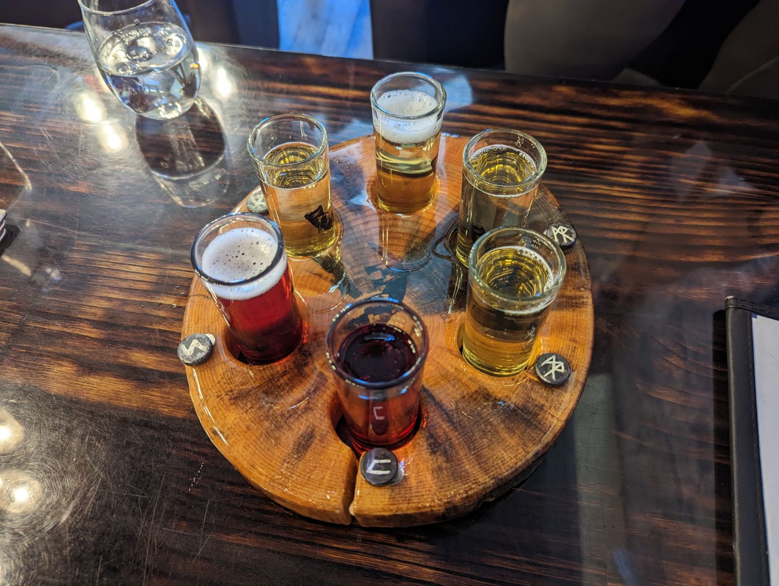 The one other meadery I've been to literally just had the one honey-ish flavor, so I was impressed by the sheer amount of options. Admittedly I was swayed by some of the names, so when I ordered my small mead flight (three samples), I went with Unicorn Blood, Mango Reaper and the more normal Strawberry. The Mango Reaper was my favorite by far. As its name implies, it had both a sweet and spicy edge and tasted an awful lot like a cocktail infused with ghost pepper. That's definitely one I'd get again. The Unicorn Blood was pretty tasty as well (on the fruitier side), but surprisingly the weak link was Strawberry, which I figured was the safest bet. For me at least, it tasted too much like cough syrup to be enjoyable. Also a cool touch - each flavor was labeled with a symbol (Norse I'm assuming, but I don't know for sure), and the flight had a cool feature with you could remove and attach the applicable symbol to the appropriate flight. I've had my share of wine flights before, but the optics on this particular one were very unique and innovative.