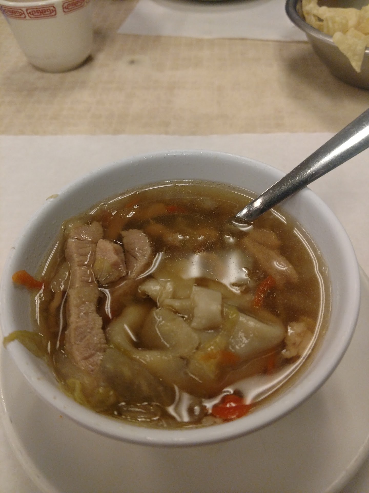 Egg flower soup was bright orange in color and had a old pork odor. We were told it was a fresh batch. The steamed wontons were mushy. When researching about egg flower or egg drop soup it says that very orange egg flower soup indicates too much food coloring. We also found a tiny stone in our fried rice. Wonton chips were more like tortilla chips. The pros to this place is their hot tea and ice tea. If you’re looking for a good Chinese hot tea this is the place to come to. Otherwise find another place to eat. The chicken lo mein was okay. It appeared to be a popular spot for the locals but our experience was not good at all. We wanted to like this place but it was not a good experience.