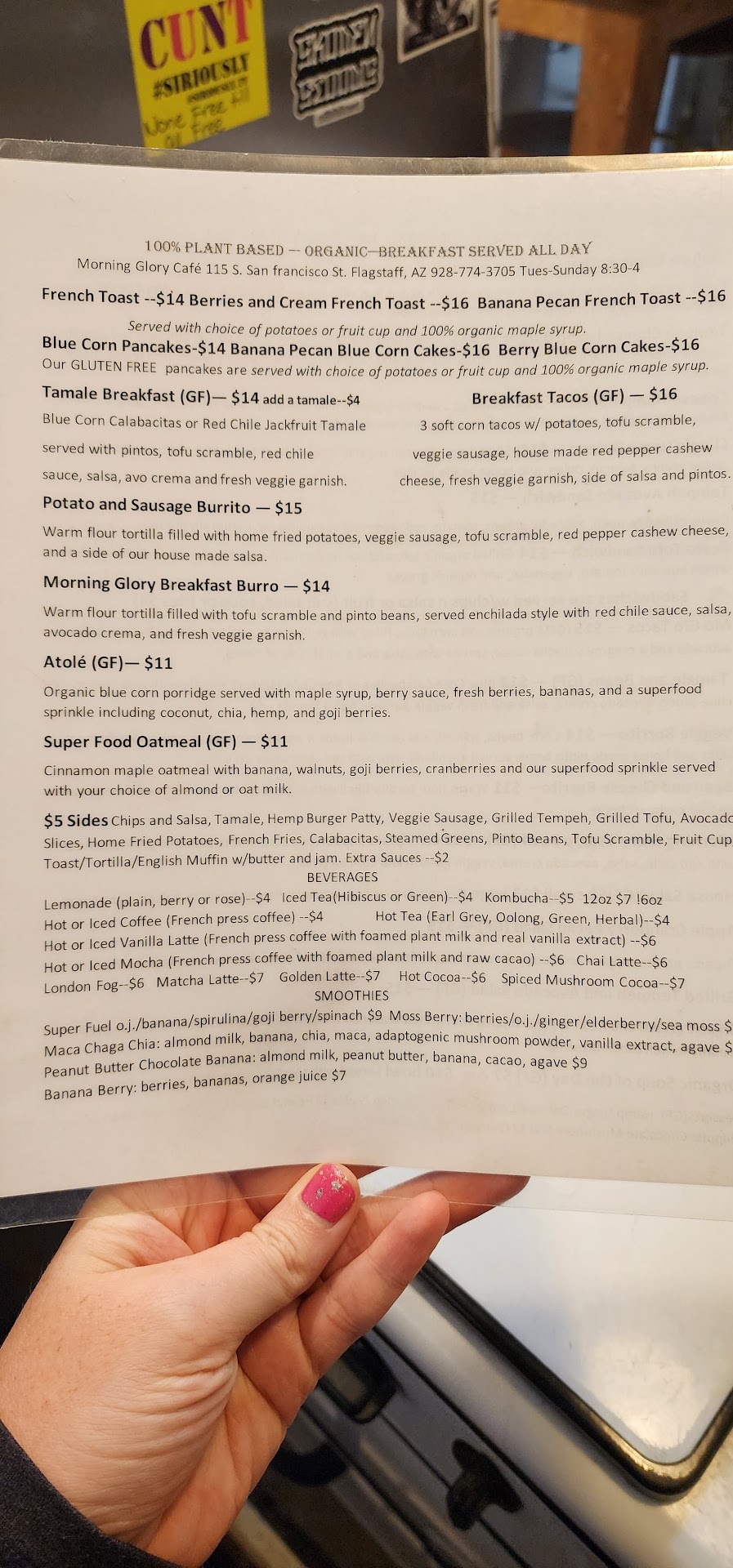 Read moreI have had the good fortune of eating at many Vegan Restaurants in the San Francisco Bay Area, Philadelphia, NYC, NJ, all over the Pacific Northwest, Various Other Places, and too many to count in Portland Oregon. My two favorites unquestionably, are the James Beard Award Winner Joshua McFadden's Tusk, which isn't exactly a Vegan Restaurant, but serves up more world class vegan choices than you can imagine throughout the year with a constantly changing menu, and Morning Glory Cafe in Flagstaff Arizona. I have been eating @ Morning Glory Cafe for almost 25 years and have never been disappointed. The real plant based offerings have beautifully balanced flavors, delicate and sublime textures whenever called for, and I always feel wonderful in mind and body after eating there. It's also one of the few restaurants in AZ that I can take my family to and know for sure they will not be getting something containing GMO Corn or Soy in one form or another, loaded with BT Toxin and Round Up Herbicide Properties inserted into it's DNA. The menu selections are extensive and you can taste the love, attention and effort that goes into every bite. The Oatmeal Hemp Cookie is probably the Best Cookie in Northern Arizona, and is right on par with Tammy Coe's Cookies made in Phoenix. Tammy Coe is a True Pastry Rock Star in my opinion. YOU WILL NOT find 10 Versions of Vegan Mac and Cheese, Impossible or Beyond Burger Devoid of any Substantial Nutritional Value, or 10 Versions of Quinoa with Soy Curls and Peanut Sauce here. Morning Glory is for Adults and Children, as well as Vegans, Vegetarians and Omnivores, who enjoy a Wonderful Blend of Savory, Sweet, Floral, Bitter and Tangy Flavors and Aromas, the way Great Food should be...