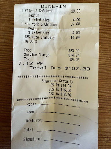 I'm giving this experience a low score and I suspect it's due to a pretty inexperienced or untalented Teppanyaki chef, but this restaurant put them out there so I think it's fair game. I could nitpick about a lot of things so I'll put those at the end. We'll just put the big ones first