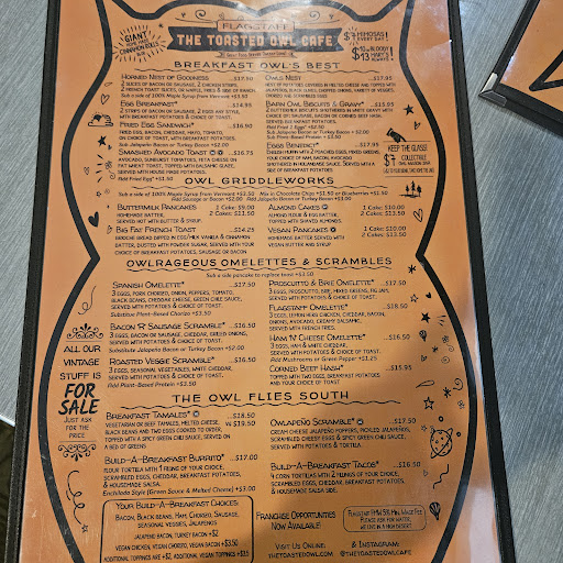 Read moreThis was a real disappointment to say the least. Service and food was horrible. And…, we were charged separately for everything. OVER PRICED. And our server Mk P was not too helpful. She was unsure of what was going on (like first day on job). We ordered Eggs (basted), biscuits, and gravy, (the gravy had a plastic taste to it). The whites in my eggs were runny and it took forever for the cook to make them again. Whoever was cooking or in charge did not know how to make basted eggs! And… it took forever to get them back and they still missed it. At least the whites were done and not runny. NOT IMPRESSED!!! I had to eat my entire breakfast off separate plates as they were brought from the kitchen to our table where my wife and I were sitting. I thought I was eating a progressive breakfast, if you know what I mean. I saw a sign that said… “everything in here is for sale.” Maybe the owner should sale the restaurant to someone that know how to do it better (RIGHT). I will never be back, nor would I recommend this place to anyone. SORRY. “THE TOASTED OWL CAFÉ (East Flagstaff, AZ.) IS BURNT...