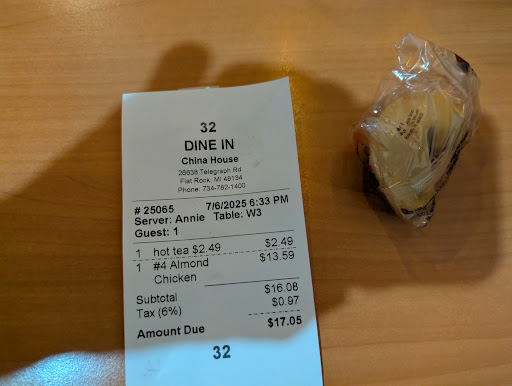 Visited this place for my first and last time today. Almond chicken half of it was burnt the sauce was a beef gravy never have I received a beef gravy for almond chicken. Menu says it’s on a bed of lettuce no lettuce in my dish. They told us they do dine in, come in they served us in all to go containers. Fried rice was ok. Egg roll or spring roll it says on the menu when we indicated egg roll the lady says it comes with an egg roll. Yes but it says egg or spring on the menu. This was not an egg roll it had no sprouts or shrimp. It was the size of an egg roll with more like spring roll inside. The wonton soup tasted like turkey broth and the wontons were stuffed with what looked like beef they were not good at all none of the usual greens in the soup. This is like 1/3 of the portion and higher priced than my usual Chinese place I love. We chose it because they dine in. But really if I wanted to eat out of to go containers and plastic utensils I would have went where I know the food is excellent. I ate less than half my food for $20. And we left the to go containers there lol…My friend ordered a water and they charged $2 dollars for a bottle water. What restaurant doesn’t have tap water available to dine in customers? This one…… When we asked about it she told us it’s in the menu. No it’s on the front of the menu. Who reads the front of the menu? And it doesn’t say no tap water, just a price for bottled water. The plum sauce and sweet and sour sauce are an unusual neon colors and tasted pretty chemically. I asked for sugar for my hot tea she brought me sweet and low. I mean I guess she thought I needed to be on a diet lol. They had a cup for the tea but I guess tap water won’t go in a tea cup lol. And no fortune cookie even Panda Express gives fortune...