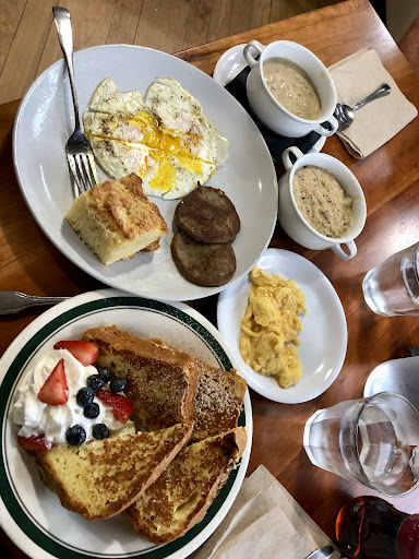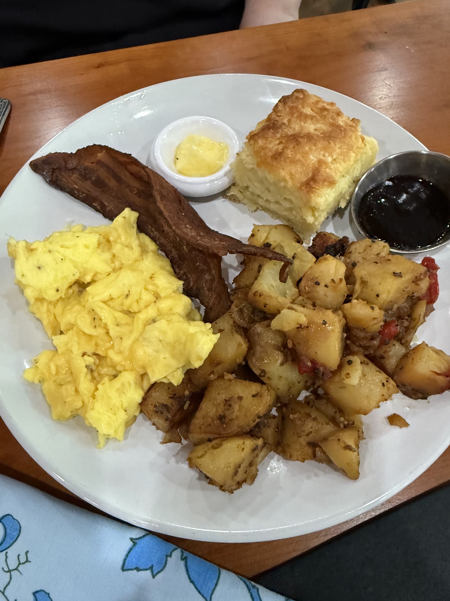 My hubby ordered the Classic American Breakfast substituting grits for the potatoes and added a side of sausage gravy. The grits are course milled but very creamy and flavorful and the gravy has chunks of sausage. His eggs were cooked perfectly, the biscuit was fluffy and not doughy and he said everything was delicious.