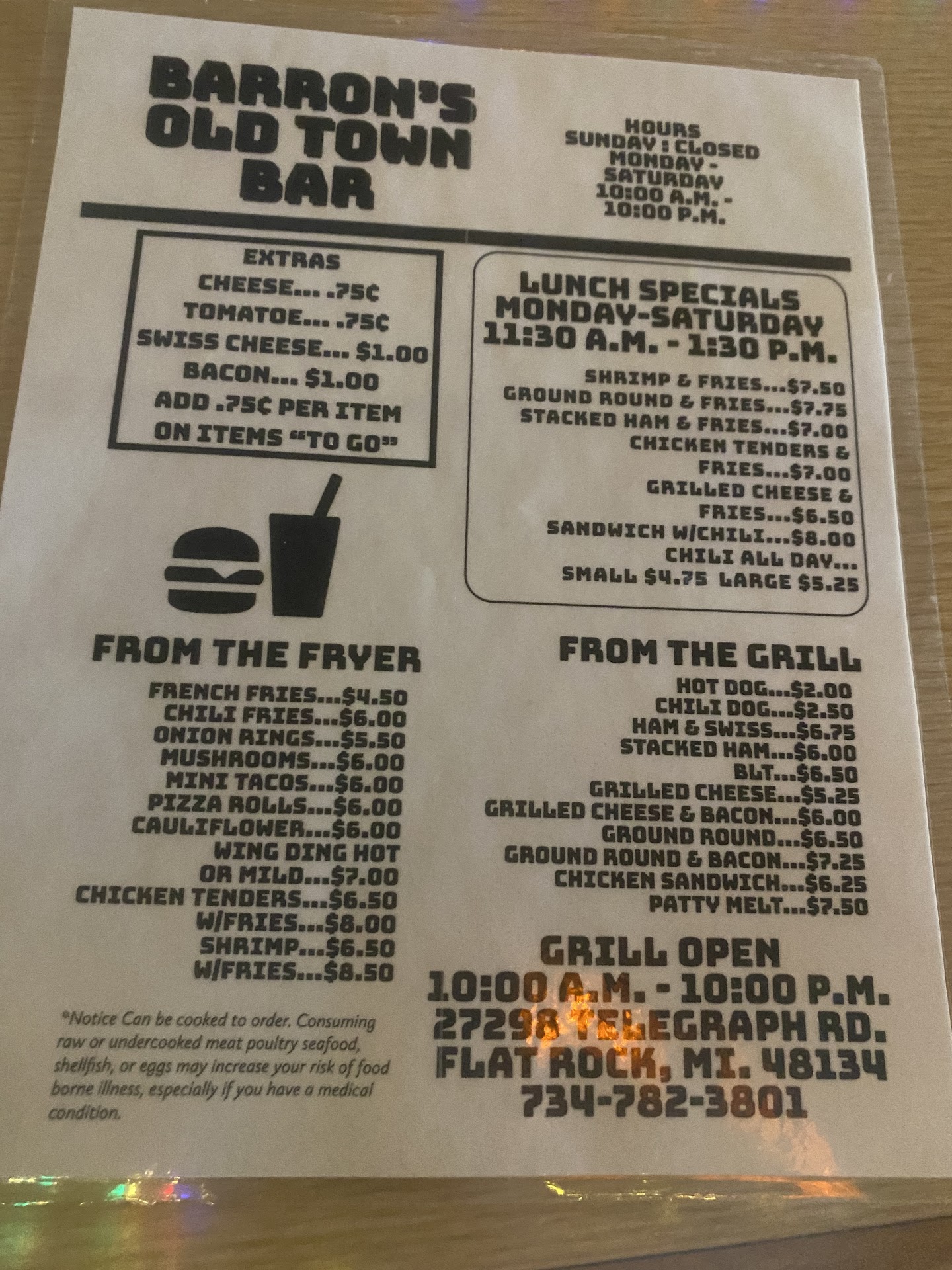 Atmosphere Located in Flat Rock Mi. on the corner of Thomas St. and Telegraph Road across the street from Mcds’ Noise Level Low noise level only a few customers at time of visit. TV playing in the background