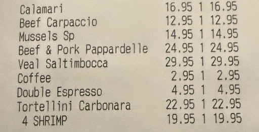 When the bill arrived, we were surprised to see that each shrimp was $5 – a $20 addition to a $23 pasta dish. While I paid without hesitation, I asked about the size of the shrimp, which seemed more like 21/25 or 13/15 at best. The waiter initially didn’t know saying “jumbo” but later claimed they were 8/10 tiger shrimp after asking the chef. As someone in the industry, it was clear this wasn’t accurate.