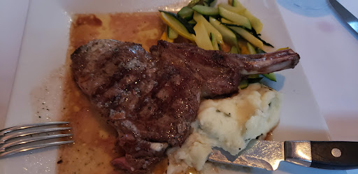 The complimentary loaf of sliced bread was brought out with a ramekin of Apple Balsamic Vinaigrette (?) that I would drink, if it were allowed - so good!! Hubby & I requested the Rustic Wild Mushroom Soup - absolutely scrumptious!! The flavors of this lightly creamy soup with the textures of finely shaved mushrooms, onions, etc - I am drooling just thinking about it. Mum enjoyed her Apple Cider Brined Pork Chop that she found to be perfectly cooked and tender. Hubby generously shared a bite of his Cowboy Steak - the Dry Aged Steak of the Night - and it was oh-so-tender and tasty!! I struggled to not scarf down my Grilled Shrimp Pasta made with fresh pappardelle, spinach, tomato garlic sauce and shaved parmesan cheese. Mmmm, the flavors and textures of each dish complement each other in the tastiest way, without being too heavy or rich. They are just right.