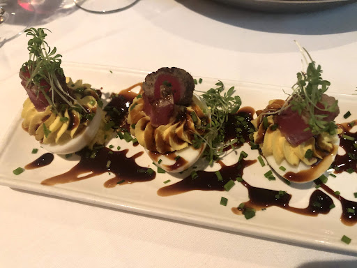 We started with east coast oysters and the deviled eggs special, which had wasabi mixed into the yolks, topped with ahi tuna, and finished with a soy glaze. Incredible flavor, beautiful presentation.