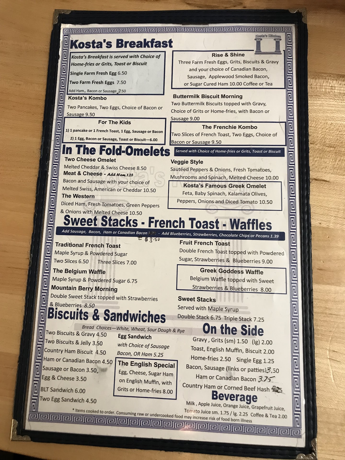 Read moreGreat place to eat in Fletcher, NC A very nice restaurant, reminiscent of an old-time diner. There is a large parking lot so parking should not be an issue. There is an outer porch with tables that you can sit at if you have a pet. There is a sign as you enter the porch that tells you to wait on the porch until the host/hostess comes out to seat you. We were greeted and seated quickly. The restaurant proper has a counter and booth lining the outer wall. There was a room with additional seating in the back of the building. We were seated at a booth near the front of the main room. The distance between the table and the seat was a little tight but the tables and the room was clean. The decor has plates displayed on shelves just below the ceiling and lots of knick-knacks. We visited near Halloween when all the waitresses had on orange shirts with various sayings like “Broom Trainer”. The waitress was efficient in taking our drink and food orders. We ordered two breakfasts of french toast and something very similar to an egg McMuffin. Both dishes came out quickly and were delicious. The cost was about $24 but was worth it for the friendly staff, delicious food, and good...