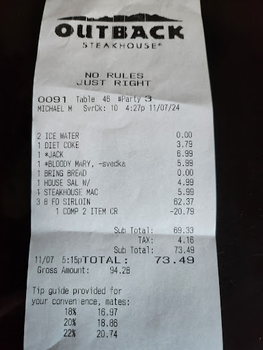 Read moreFirst off, I'm disabled and my date and parked in front of the restaurant. On a Friday night there seemed to more staff than patrons. We asked for a booth. We were led to a booth in back of the restaurant.....there were only 2 farther from the door! Walked by empty booths everywhere. I think this was done on purpose. Second, I asked for a Guiness and was told no, we dont carry it. Then, the only rib eye steak they had was 13 ounces. My date ordered and I asked if I could get shrimp instead of lobster on filet mignon and lobster combo. Again, NO. So I'm looking at the menu and some other woman came and basically dropped my dates salad in front of her! I hadn't even ordered yet! She looked at me and I looked her and then looked at the salad. The whole vibe of the restaurant felt cold towards us and we were nothing more than an inconvenience. I said at this point let's go. We went down the road to the Texan Steakhouse and got great service, food and the place was packed! Our bill came to $76.00 and I left the waitress a $20.00 tip. A restaurant with no customers on a Friday night is a restaurant to avoid. There's a reason for that. I will never go to Outback again after the treatment we got. I can't rate on the food, we never got that far. Why should I help you? This isn't the first time I've had a problem at your restaurant. The first time was when my friend had to go search for someone to pay. I went outside and lit a cigarette and was bum rushed by your staff like we weren't going to pay. I was just standing there. Why wasn't I running? You sent me coupons then. Coupons won't fix this because I won't be back. My date wanted to go there, I didn't. After the way we were treated, your restaurant has problems! The amount of people in the dining room on a Friday night proved that. Now you want me to enroll to contact you? I don't think so. Bring a salad when everybody at the table hadn't ordered set the tone. It was the way she set it down also.....felt like we were at Mel's Diner! Before that, make me walk farther from the door to a booth than from the car to the front door.....carrying an oxygen machine and a cane! I think the word is out about you and I don't see you surviving. We had a great time once we left and went to a busy restaurant and were professionally served.....and treated...