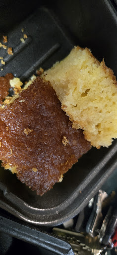 The corn muffins were greasy, resembling a butter-soaked rum cake. Their wet texture was not appetizing.