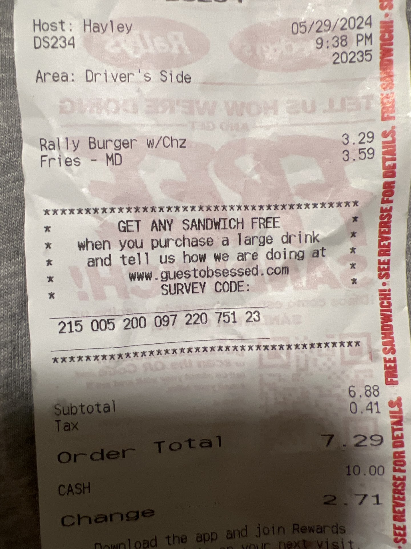 Read moreI got to Rally’s with 2 cars ahead! The cashier asked for my order I placed it.. I sat I Rally’s Drive-Thru line for 30 mins due to the car in front of me refunding food or whatever. Instead of the workers telling the customers to pull forward they made the customers wait while they had our food waiting! The Car finally pulled off and I made it to the window and was never greeted or spoken too! She immediately left the window to continue taking care of the car in front of me! I sat there for another 7 mins until one of the cooks finally decide to come and confirm my order. She finally returns and he tells her she owes me change and she hands me my food! I asked her how long had the food been sitting there she proceeds to say the cook had just made it, when I seen when the cook brought it to her while I was waiting in line! She proceeds to tell me that I wasn’t waiting that long! I take the food! FRIES ARE FREEZING COLD AND BURNED AND HARD AND MY BURGER IS DROWNED WITH MAYO THE BUN OR TOMATO WOULDNT EVEN STAY ON! SMH I WOULD NOT CALL...