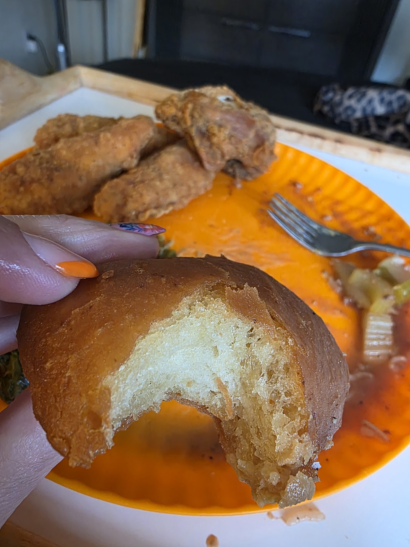 Read moreThe chicken had a lot of seasoning which I could appreciate but it was super dark like it was cooked in old grease. I thought I would like the fried dinner roll because it gave elephant ear vibes but it was overly greasy I even tried to reheat it in the air fryer to bring it back to life but I love the concept I think if I was fresh it might have been good. The beans and rice surprise me because they had celery in it which I've never had before and it also had kidney beans those are not a bean I'm used to seeing in my beans and rice. The flavor was great though. The macaroni and cheese was really creamy and had good flavor in the greens had visible chunks of meat in it those were delicious too. Overall I would definitely go back here and try them again on another day this was my first time and I know they're new and they're probably overwhelmed. It wasn't horrible it just wasn't as good as I think it...