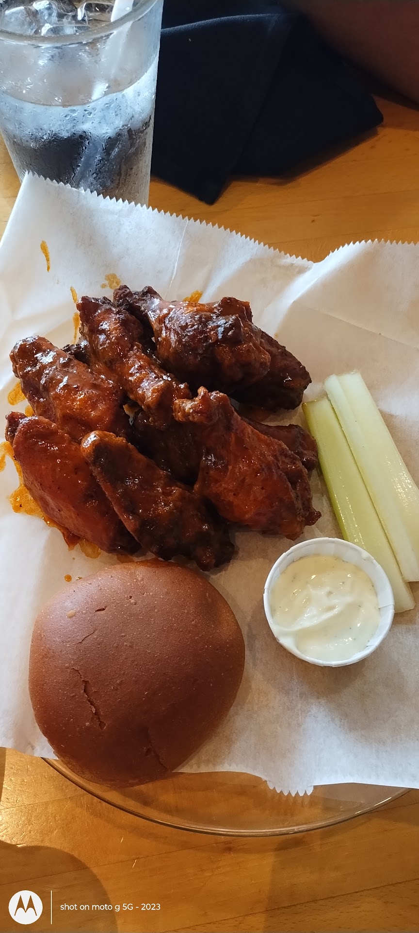 I ordered their “famous” wings, and the seasoned fries, both were good, just basic buffalo, no other flavors. I didn’t get napkins, I didn’t get the ranch I ordered. I got the bar tender’s attention, and asked for napkins, ranch, and a refill, she brought me napkins, I waited like 6 minutes, and asked for ranch and a refill again, she went tot he back and got the ranch. Upon her return she could tell I was frustrated. She informed me she wasn’t a bar tender she was just filling in. I decided to cut her some slack and ask for my bill, I got tired of begging for a refill.